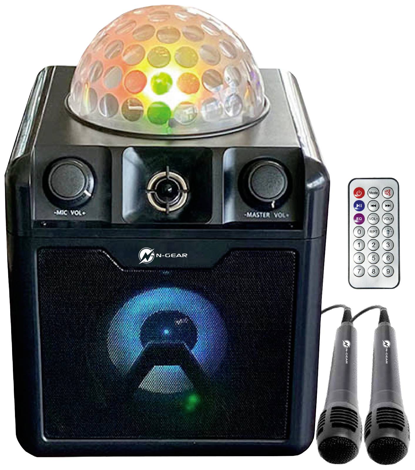 Klein, kompakt & voller Party Power! Mit dem N-Gear DISCO410 Bluetooth Lautsprecher und Ihrer Lieblingsmusik starten Sie überall die nächste Party! Der coole Speaker überzeugt mit insgesamt 50 Watt Leistung und begeistert daheim oder unterwegs. Voll aufgeladen spielt er bis zu 6 Stunden die eigene Musik vom Tablet oder Handy. Neben Bluetooth, lässt sich der Speaker auch per Audiokabel ansteuern. Zudem können MP3s per USB-Stick (max. 64 GB) oder microSD-Karte (max. 64 GB) wiedergegeben werden. Besonderes Highlight: Dank der coolen Discokugel wird jeder Raum mit bunten Funkellichtern in Szene gesetzt. Somit ist der N-Gear DISCO410 der perfekte Soundwürfel für die nächste Geburtstagsfeier, WG-Party oder lange Festivalnacht. Damit auch dem Smartphone niemals die Energie ausgeht, lässt sich der N-Gear Bluetooth Lautsprecher auch als Powerbank nutzen. Hierfür wird das Mobilgerät einfach per USB mit dem Speaker verbunden. Um die Party mit einer kurzen Ansprache zu eröffnen oder ausgelassen zur Musik mitzusingen, wird der DISCO410 mit einem kabelgebundenen Mikrofon ausgeliefert. Im Lieferumfang ist außerdem ein microUSB-Kabel zum Aufladen enthalten.