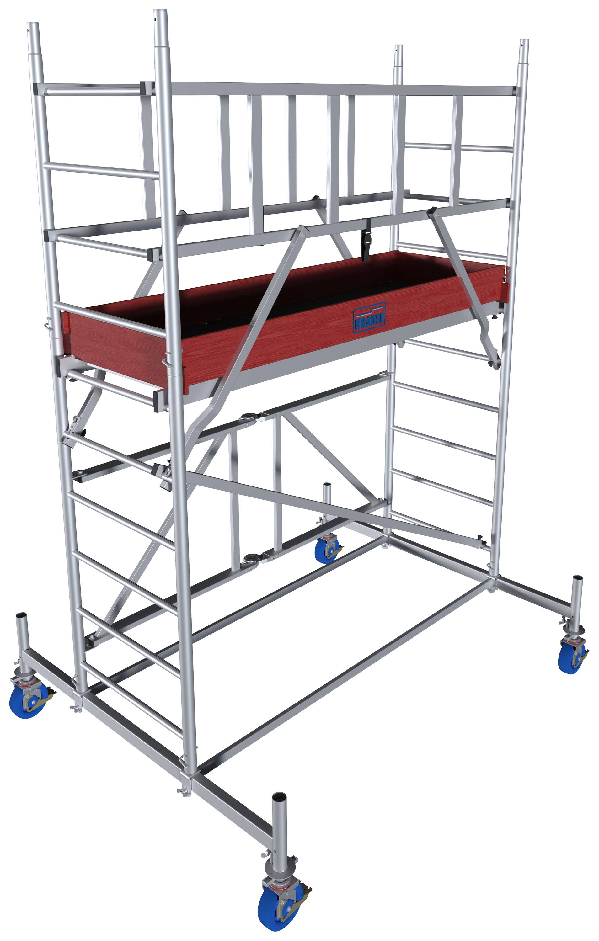 Die Grundeinheit passt mit 1,80 m Höhe aufgebaut durch Türrahmen und ist aufstockbar bis zu einer Arbeitshöhe von 11,80 m