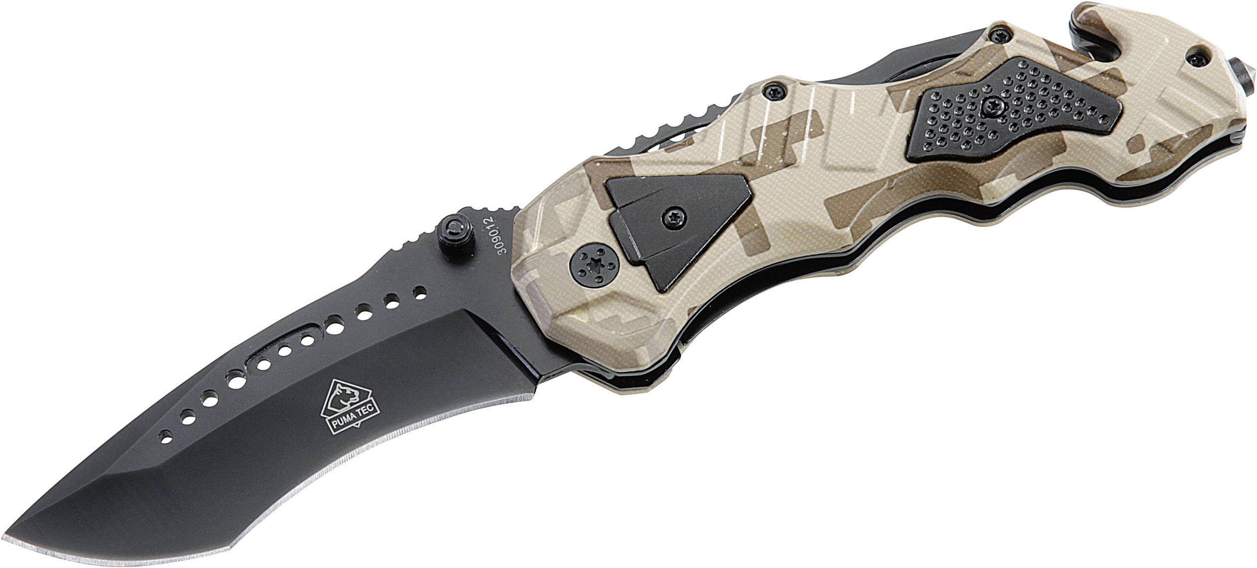 Eindrucksvoll präsentiert sich dieses kräftige Puma TEC Einhand-Rettungsmesser. Eine schwarz beschichtete Recurve-Klinge aus rostfreiem AISI 420-Stahl in Verbindung mit Aluminium-Griffschalen in Camouflage-Optik machen dieses Messer zum echten Hingucker. Schwarze Applikationen in den Griffschalen sowie zahlreiche Öffnungen unterhalb des Klingenrückens unterstreichen die ungewöhnliche Optik. Beidseitig montierte Daumen-Pins lassen die Klinge mühelos in Arbeitsstellung bringen, und ein Liner Lock sichert die Klinge zuverlässig. Eine Daumenauflage sowie Fingermulden sorgen für eine sichere Handlage. Ein Gurtschneider und ein Glasbrecher am Griffende komplettieren die Ausstattung.