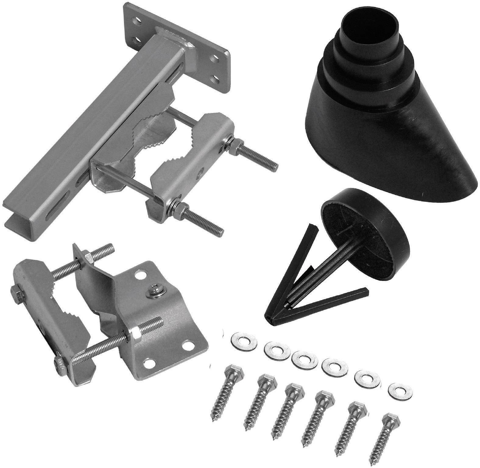 1x Gummitülle für Masten Ø 38 - 60 mm + 1x Mastfuß für Masten bis Ø 60 mm + 1x Mastschelle universal für Masten von Ø 38 - 60 mm + 1x Mastkappe für Rohre + 4x Holzschraube 8 x 50 mm.