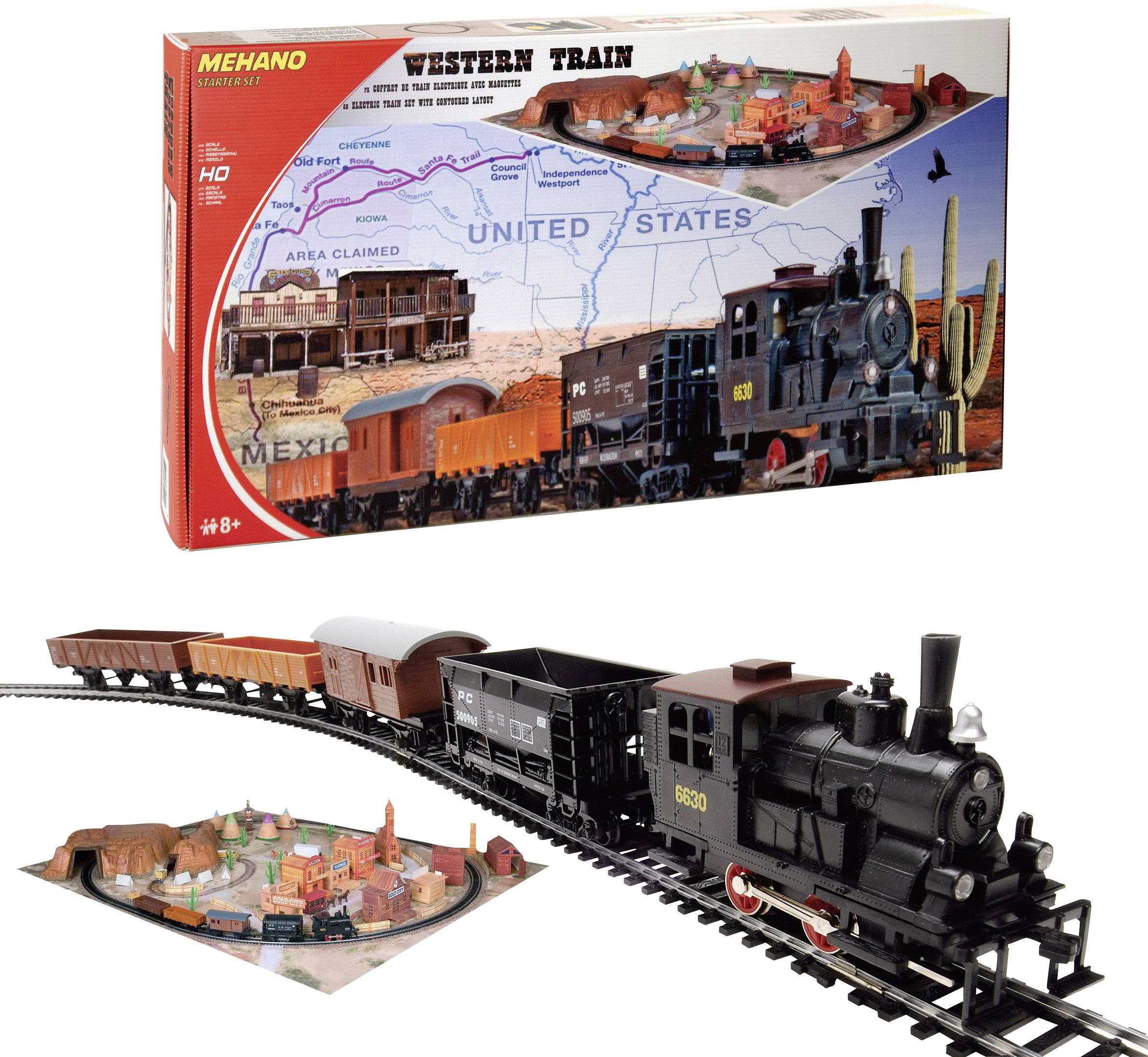 Das Set enthält: 1 Dampflok · 2 offene Güterwagen · 1 Schüttgutwagen · 1 Güterzug-Begleitwagen · 12 gebogene Gleise (Durchmesser vom Gleiskreis 955 mm) · 1 Fahrregler mit Netzteil (230 V 50 Hz) · 10 Gebäude · 2 Pferdekutschen · 8 Zelte · 9 Kakteen · 12 Zäune · 1 Spielfläche mit Landschaftsplan (Abm. 1250 x 1000 mm) aus Karton · 1 Felsenrelief.