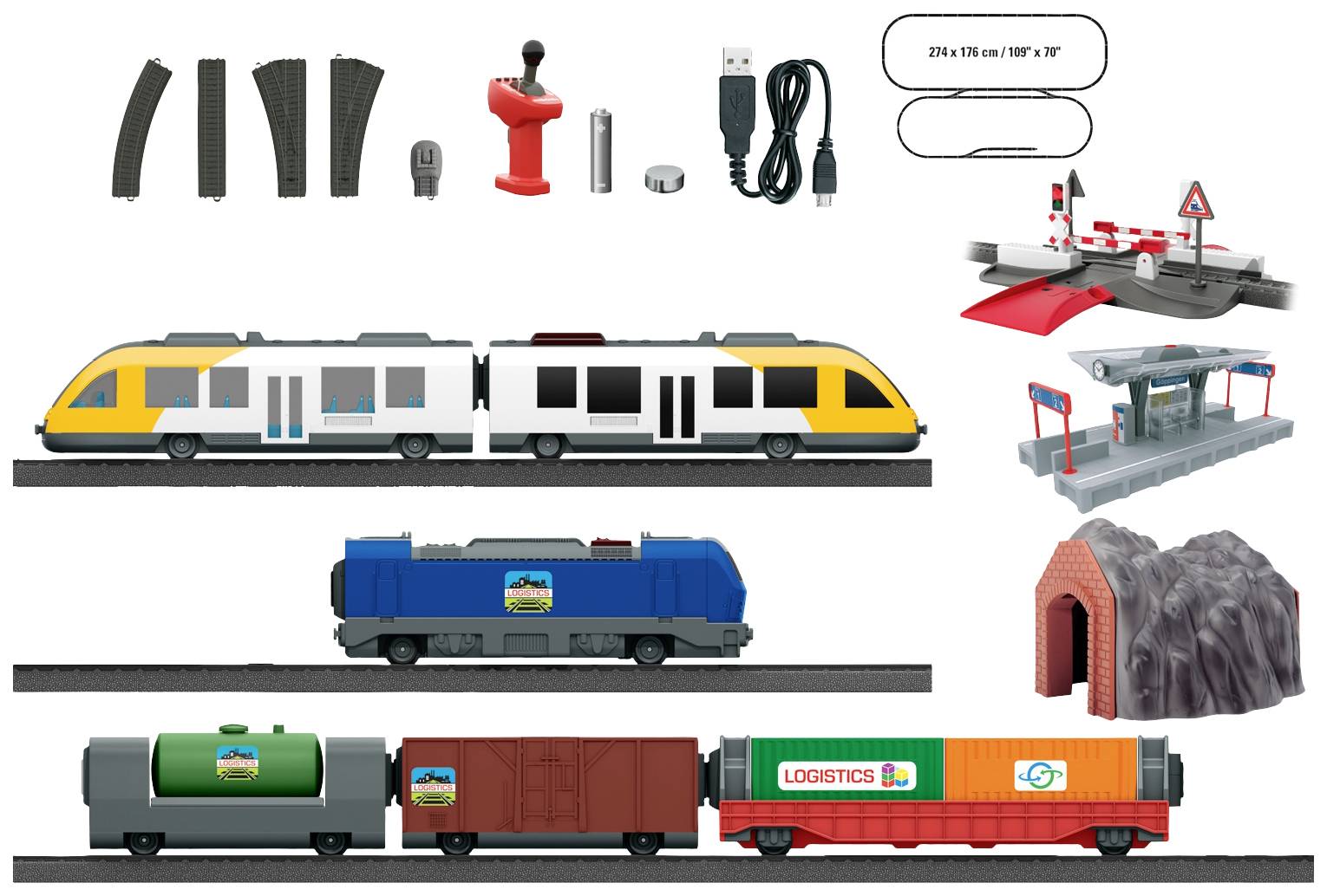Vorbild: Ein zweiteiliger Nahverkehrszug LINT und ein Güterzug bestehend aus einer modernen Elektrolokomotive Vectron, einem Containertragwagen mit zwei 20-Fuß-Containern beladen, einem offenen Güterwagen und einem Kesselwagen in farbenfroher Gestaltung. Modell: Beide Züge mit Akkuantrieb und Magnetkupplungen zwischen den einzelnen Wagen. Motoren, Akkus und die gesamte Elektronik sind für Kinder unzugänglich verbaut. Die Loks können mit dem mitgelieferten USB-Ladekabel aufgeladen werden. Jeweils 3 Geschwindigkeitsstufen bei Vorwärts- und Rückwärtsfahrt, 3 Soundfunktionen und ein Spitzensignal. Für den umfangreichen Einstieg in die spannende Welt der Eisenbahn liegt der Startpackung ein Tunnel, ein manueller Bahnübergang und ein Bahnsteig bei.Länge des Personenzugs 32,6 cm.Länge des Güterzugs 58,5 cm.Inhalt: 25 gebogene Kunststoffgleise, 40 gerade Kunststoffgleise, 3 Weichen links, 2 Weichen rechts und ein Prellbock. Für jeden Zug liegt ein kindgerechter Märklin Power Control Stick bei. Stickerbogen. Ein USB-Ladekabel, 6x AAA Batterien, sowie 3x LR44 Knopfzellen sind im Lieferumfang enthalten. Erweiterbar mit der Kunststoffgleis-Ergänzungspackung 23400. Die Züge können jeweils mit 2 verschiedenen Frequenzen betrieben werden und somit um weitere my world Züge ergänzt werden.Personenzug (U/V)Güterzug (W/X)