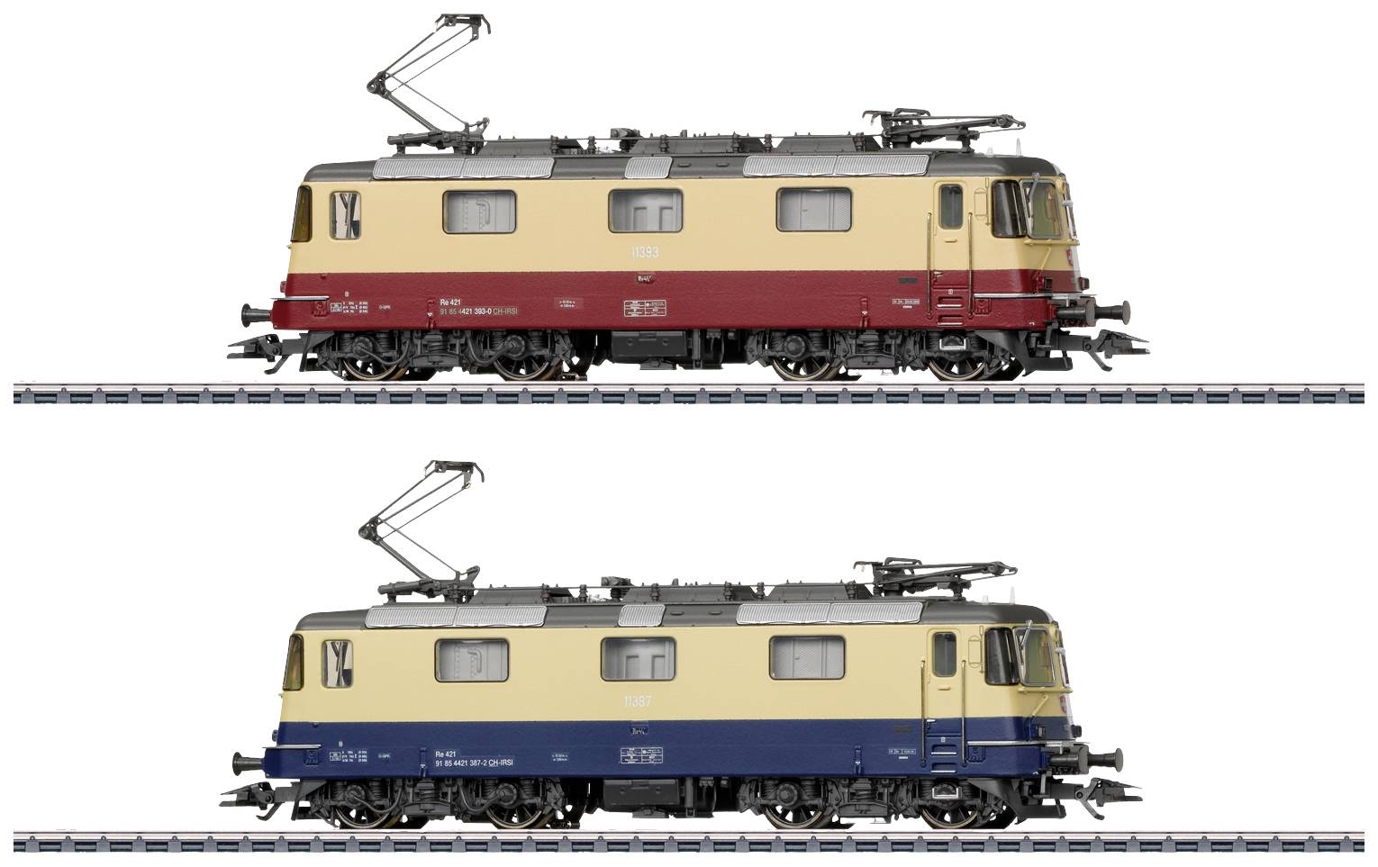 Vorbild: 2 Elektrolokomotiven Re 421 in unterschiedlichen Farbgebungen. 1 Elektrolokomotive in TEE-Farbgebung purpurrot/beige mit der Betriebsnummer 421 393-0 und 1 Elektrolokomotive in Rheingold-Lackierung kobaltblau/beige mit der Betriebsnummer 421 387-2. Privatbahn-Lokomotiven der International Rolling Stock Investment GmbH (IRSI), betrieben von der TR Trains Rail AG. Betriebszustand um 2020. Modell: Für beide Lokomotiven gilt: Mit Digital-Decoder mfx+ und umfangreichen Licht- und Geräuschfunktionen. Geregelter Hochleistungsantrieb mit Schwungmasse, zentral eingebaut. 4 Achsen über Kardan angetrieben. Haftreifen. Fahrtrichtungsabhängig wechselndes Dreilicht-Spitzensignal und 1 weißes Schlusslicht (Schweizer Lichtwechsel) konventionell in Betrieb, digital schaltbar. Beleuchtung umschaltbar bei Solofahrt auf 1 rotes Schlusslicht. Spitzensignal an Lokseite 2 und 1 jeweils separat digital abschaltbar. Doppel-A-Licht als rotes Nothalt-Signal. Fernscheinwerfer, Führerstandbeleuchtung und Maschinenraumbeleuchtung jeweils separat digital schaltbar. Beleuchtung mit wartungsfreien warmweißen und roten Leuchtdioden (LED). Angesetzte Griffstangen seitlich und frontal aus Metall. Kupplungen gegen beiliegende Frontschürzen austauschbar. Länge über Puffer 17,1 cm. Beide Lokomotiven sind einzeln verpackt und gekennzeichnet, mit zusätzlicher Umverpackung.