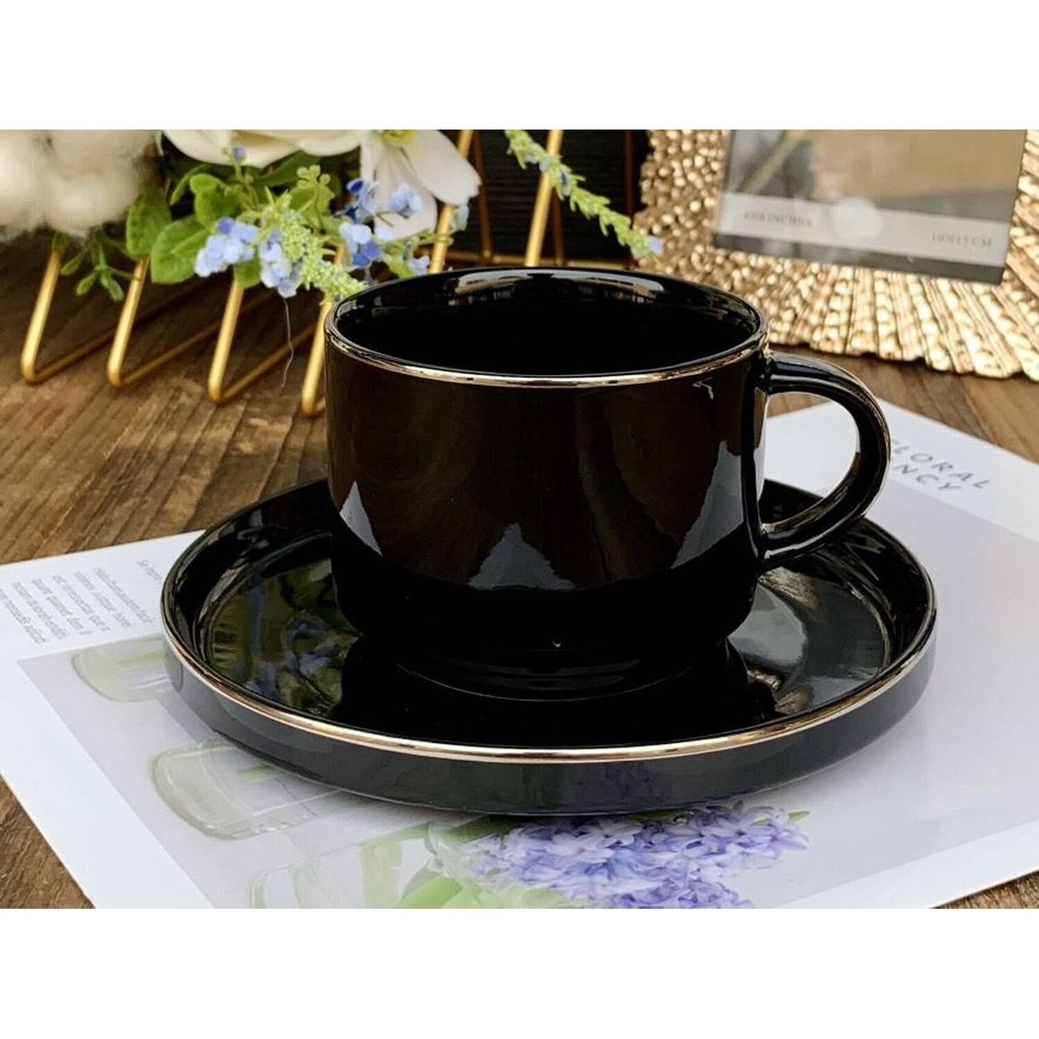 12-Teiliges Kaffeeset aus Porzellan mit Untertassen Kaffeebecher Tasse Schwarz mit Gold Umrandung Espressotasse