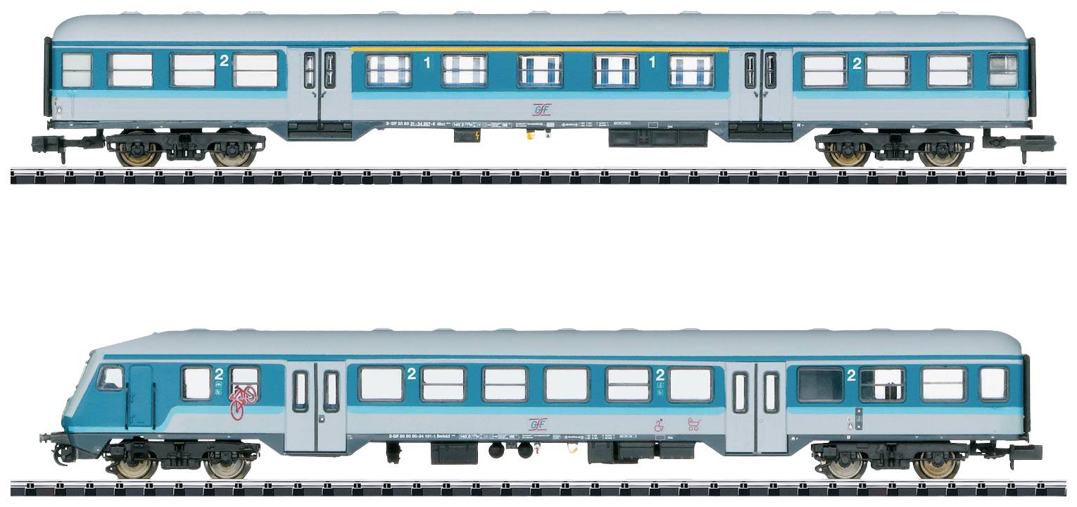 Vorbild: Nahverkehrswagen 1./2. Klasse ABnrz und Nahverkehrssteuerwagen Bauart Bnrbdzf 480.1 (Betriebsnummer: 50 80-34 101-1) der Gesellschaft für Fahrzeugtechnik mbH (GfF).Aktueller Betriebszustand. Modell: Mit Kinematik für Kurzkupplung. Steuerwagen mit 3-Licht-Spitzensignal auf der Führerstandseite mit Lichtwechsel 3x weiß und 2x rot, mit 14-poliger Digital-Schnittstelle und mit beleuchteter Zugzielanzeige. Vorbereitet für den nachträglichen Einbau einer Innenbeleuchtung. Gesamtlänge über Puffer 330 mm.Die dazu passende Innenbeleuchtung:66611 LED-Innenbeleuchtung (Steuerwagen).66612 LED-Innenbeleuchtung. Einen kompletten Zug erhalten Sie mit dem Wagen der 2. Klasse Artikelnummer 18435 und der Elektrolokomotive Baureihe 115 Artikelnummer 16267.