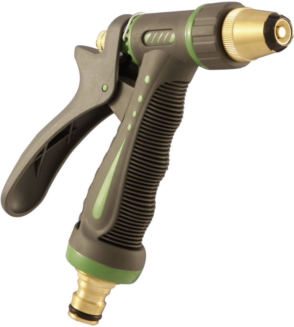 Garten-Spritzpistole aus Leichtmetall, massive Ausführung, kunstoffbeschichtet, Anschlussgewinde IG 24,2 mm 3/4" mit Dichtung, stufenlos verstellbar von Sprühstrahl auf Vollstrahl, feststellbar. Mit montierter Messing-Steckkupplung.