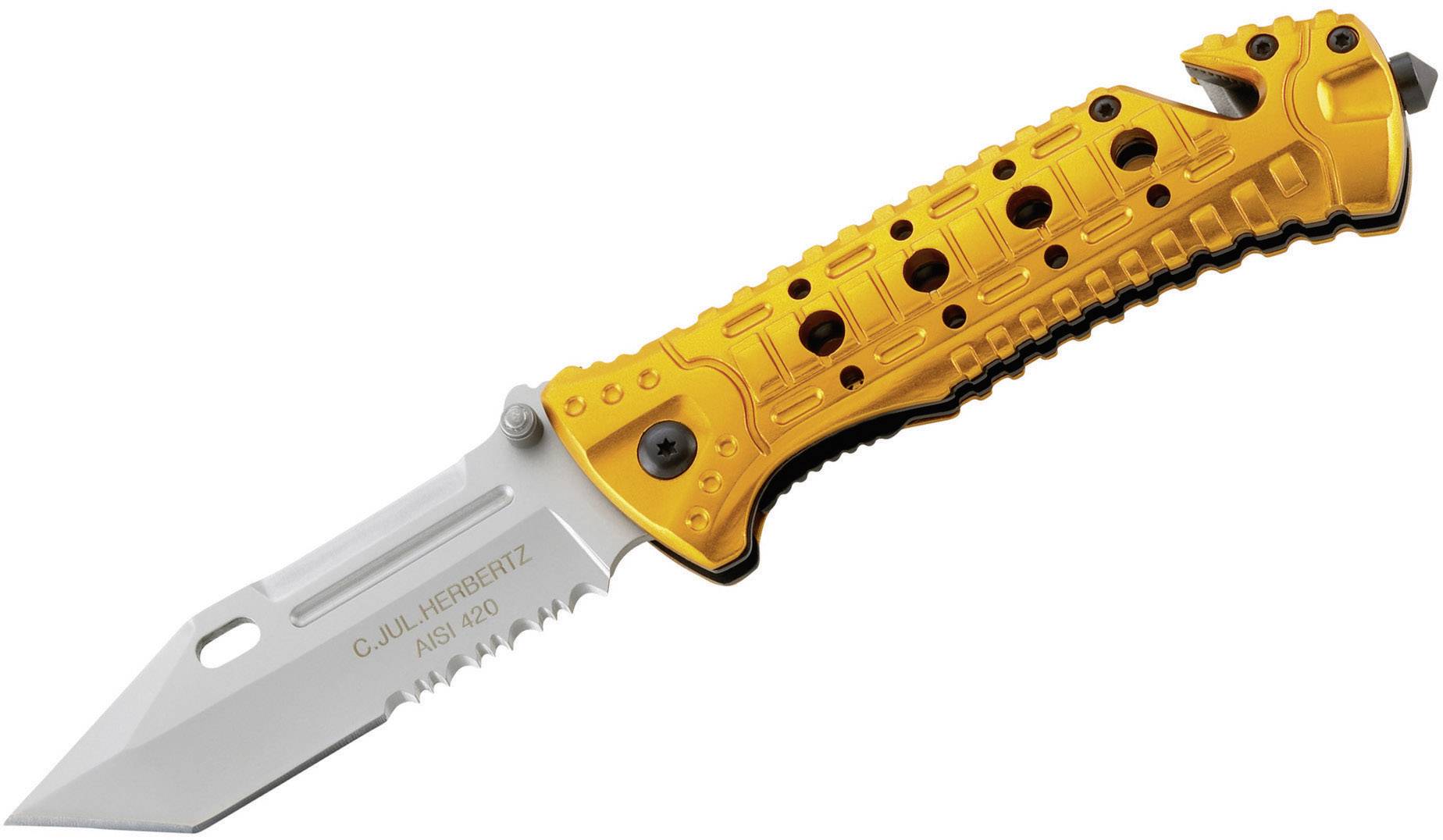 Durch die kräftige Farbgebung und die auffällige Gestaltung des Heftes ist dieses Rettungsmesser nicht zu übersehen. Die mattierte Tanto-Klinge aus dem rostfreien Stahl AISI 420 ist mit einer Teilsägezahnung ausgestattet und lässt sich über den beidseitig montierten Klingenknopf schnell in Arbeitsstellung bringen. Ein Liner Lock sichert die Klinge zuverlässig in geöffneter Position. Die markanten Griffschalen aus eloxiertem Aluminium sorgen für eine sichere Handlage. Ein Gurtschneider und ein Glasbrecher sind zur Stelle, wenn sie benötigt werden.
