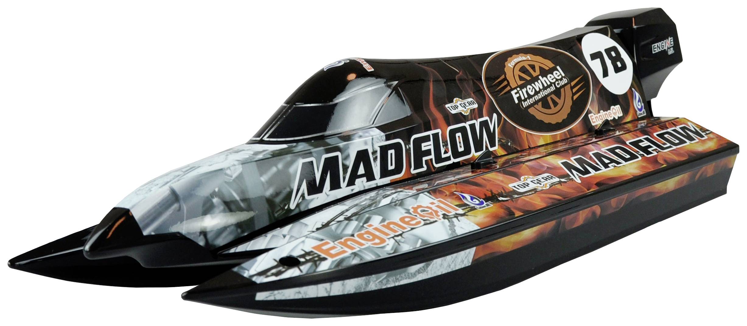 Ein schnelles und wendiges Katamaran-Boot mit kompakten und handlichen Außenmaßen. Ein kräftiger, wassergekühlter brushless Aussenläufer-Motor beschleunigt das Boot bis auf über 55 km/h. Ein 30A ESC mit XT60 Anschluß, ein 9g wasserfestes Metallgetriebe Lenkservo und eine feinfühlige 2,4 GHz digital proportionale Fernsteuerung sind weitere Highlights des Mad Flow Speed Boots. Der robuste Rumpf ist Dank eines Flutkanals selbstaufrichtend falls das Modell doch mal auf der Seite liegt. Der gesamte hintere Teile der Flexwelle in Verbindung mit der Außenboarder Attrappe dient hier als Ruder. Dies macht den F1 Renner extrem wendig. Daher ist das Boot für Einsteiger wie auch für Fortgeschrittene bestens geeignet.