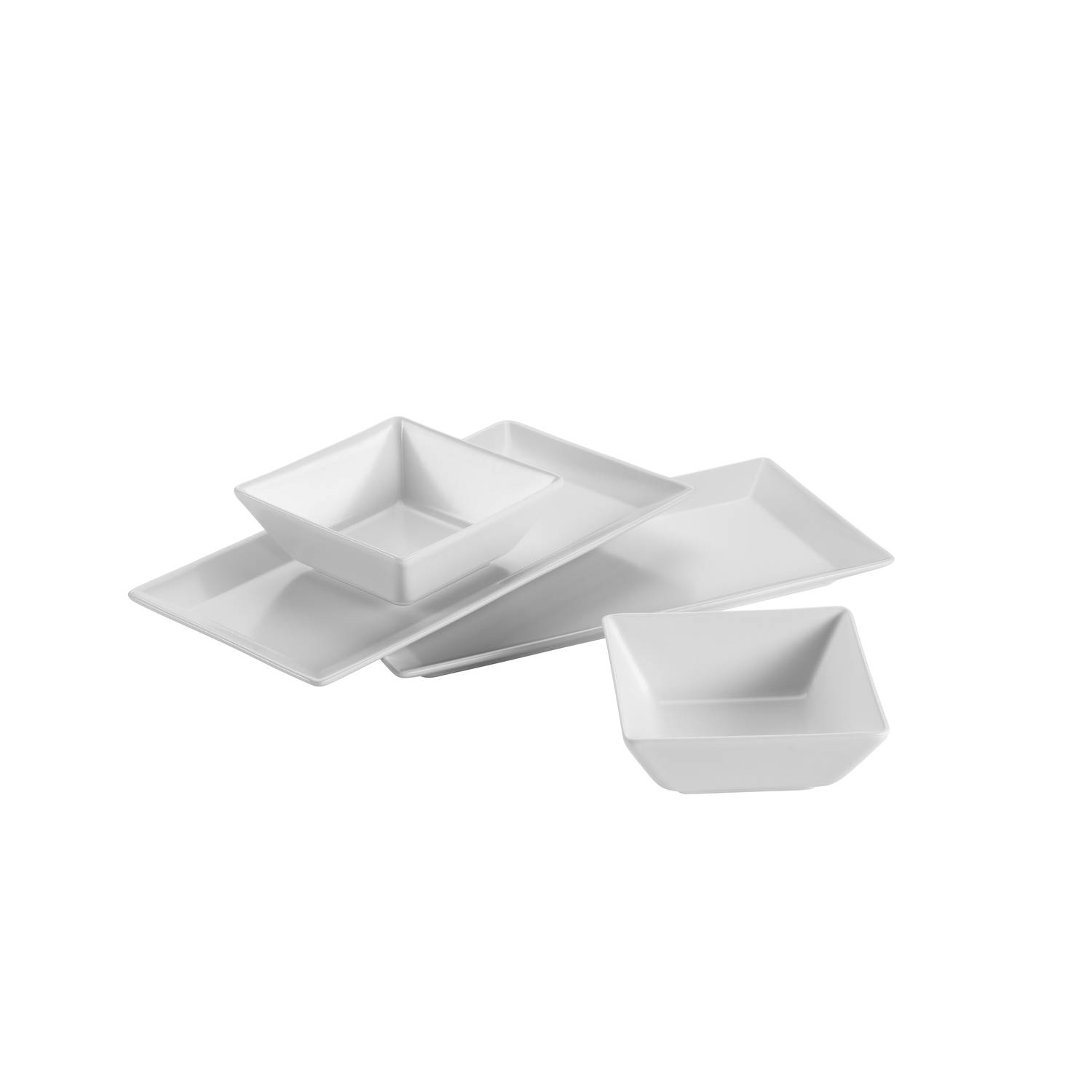 - Porzellan Geschirr Set für 2 Personen bestehend aus zwei Schalen quadratisch à 13 x 13 x 4,8 cm und zwei rechteckigen Platten à 30 x 15 cm jeweils in Weiß.
