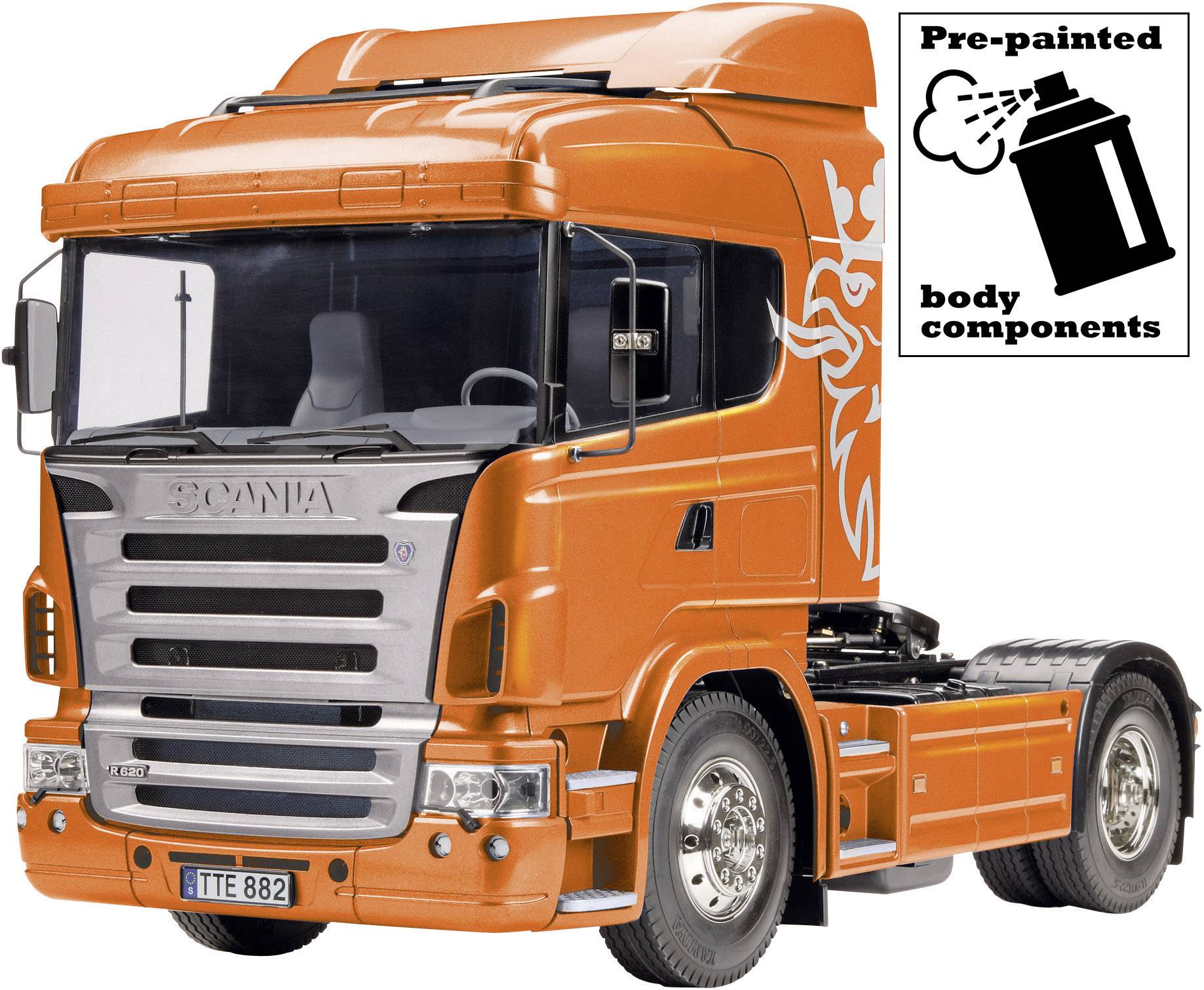 Diese Zugmaschine der TAMIYA Truckserie ist ein echtes Highlight. Das Modell des „Truck of the Year 2005“ ist außergewöhnlich fein detailliert und das perfekt nachgebildete Fahrerhaus des TAMIYA Scania R470 Highline mit Aerodynamikpaket besitzt sogar eine originalgetreue Innenausstattung. Die Sonderedition mit vorlackiertem Fahrerhaus wurde zum 20-jährigen TAMIYA Truckjubiläum aufgelegt. Unter dem nach vorne kippbaren Fahrerhaus finden sich eindrucksvolle technische Detaillösungen. Ein kräftiger Elektromotor treibt über ein 3-Gang-Schaltgetriebe den rund 45 cm langen Modelltruck an. Ein detailgetreuer Aluminium-Leiterrahmen verleiht dem Bausatz die erforderliche Stabilität. Dank seines hohen Eigengewichts und einer Sattelplatte, mit der zahlreiche TAMIYA und CARSON-MODEL SPORT Auflieger angekoppelt werden können, lassen sich imposante Gespanne zusammenstellen und natürlich auch fahren.
