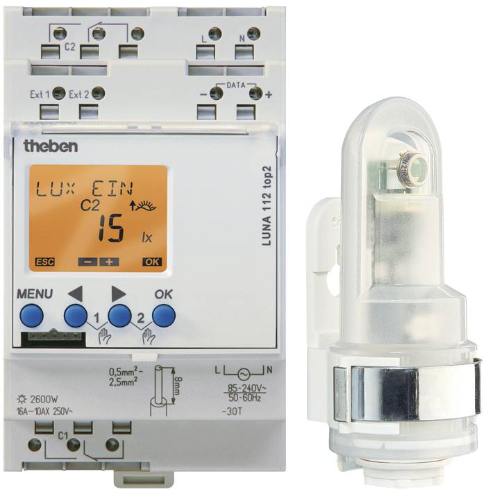 Reiheneinbau-Dämmerungsschalter, Breite 35 mm, separater Aufbau - Lichtsensor (IP55), Helligkeitsbereich: 1 - 99000 Lux, Ein-/Ausschalt- Verzögerung 0- 59 min., textorientierte Bedienerführung und hinterleuchtetes Display, Schnittstelle Speicherkarte/PC, 2 externe Steuereingänge mit 5 Funktionen, Betriebsstundenzähler für Leuchtmittel, EIN/AUS permanent, DuoFix- Steckklemmen, Nulldurchgangsschaltung, 2 Wechsler 16A/250V~, Klarsichtabdeckung plombierbar.