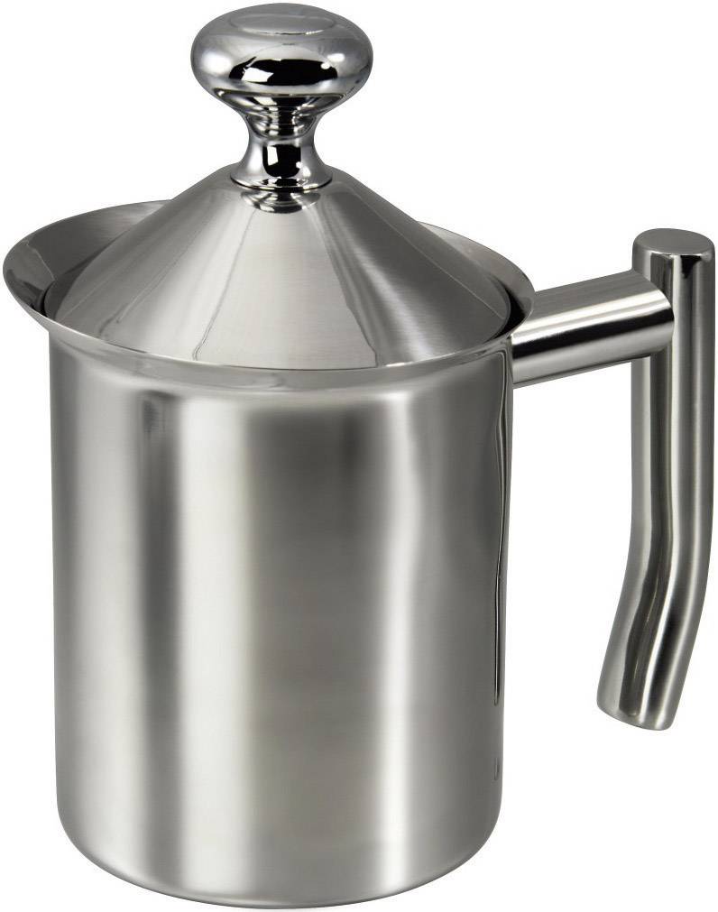Kanne mit Deckel und Griff aus hochglanzpoliertem rostfreien Edelstahl und integriertem Aufschäumer aus Kunststoff