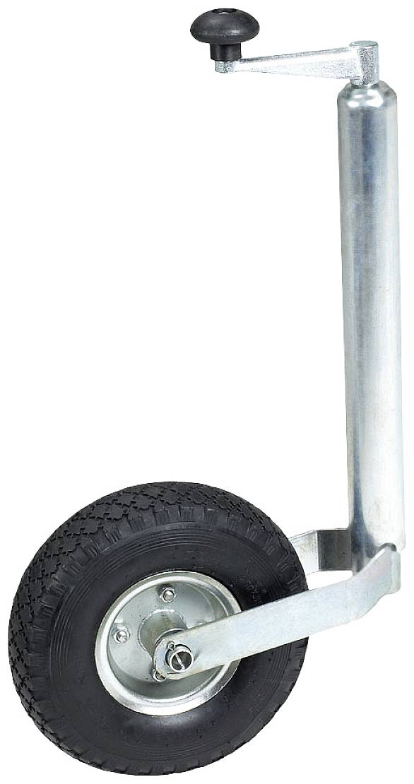 Anhänger Stützrad mit Luftreifen für PKW-Anhänger. Aus starkwandigem Stahlrohr verzinkt mit einer stabilen Spindel und Kurbel. Luftbereifung 260 x 85 mm auf Metallfelge, kugelgelagert. Durchmesser 48 mm, Stützlast max. 150 kg, Gesamthöhe 600 mm, Hubhöhe ca. 220 mm