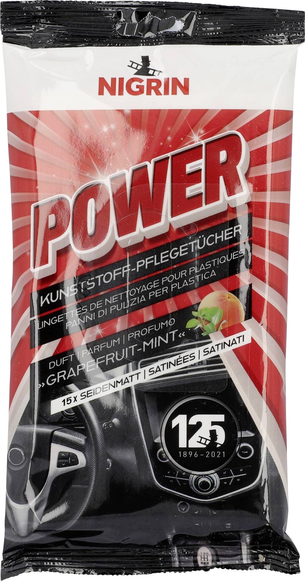 Die praktischen POWER-Tücher reinigen, pflegen und schützen alle Kunststoff-, Gummi- und Vinyloberflächen im Fahrzeug-Innenraum schonend, schnell und mühelos. Die Feuchttücher sind mit einer POWER-Lotion durchtränkt, die farbauffrischend und antistatisch Schmutz und Wasser abweisend wirkt. Sie verleiht den Oberflächen ein glänzendes Finish und ist dabei frei von Silikonen. So wird die Bildung von Flecken durch Sonneneinstrahlung und Hitze zuverlässig verhindert. Die regelmäßige Anwendung beugt der vorzeitigen Alterung und Versprödung der Kunststoffe vor. Die Tücher riechen angenehm nach Grapefruit und Minze und sind im praktischen, handlichen und wiederverschließbaren Flatpack- ideal für ins Handschuhfach.