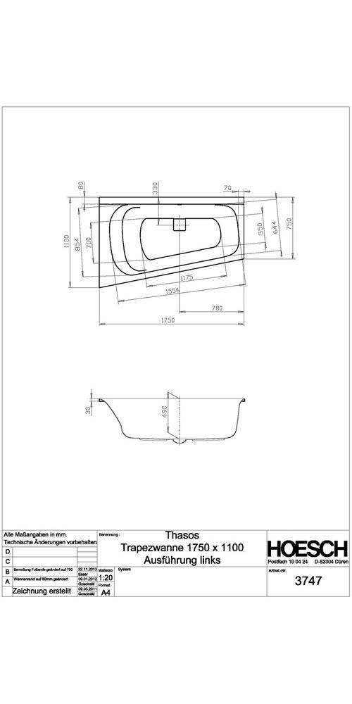 Nutzinhalt 200 l · Acryl · Wannengriffe oder Wannenrandarmaturen können auf der ebenen Fläche am Wannenrand positioniert werden · inkl. weißer Ablaufabdeckung · Ablaufabdeckung auch in chrom erhältlich Weitere technische Eigenschaften: · Anzahl der Personen: 1 · Armaturenlochbohrung optional: Ja · Boden Breite (Breite Liegefläche): 700mm · Boden Länge (Länge Liegefläche): 1175mm · Breite (1): 1100mm · Durchmesser Ablaufloch: 52mm · Eckwanne: Ja · Form (1): Kombinationsform (asymmetrisch) · Füße verstellbar: Ja · Glanzgrad: glänzend · Grifflochbohrung optional: Ja · Höhe einschließlich Füße: 635mm · Inhalt: 355l · Länge (1): 1750mm · Materialstärke: 4mm · Mit Füßen: Nein · Mit Überlaufloch: Ja · Mit Wannenverkleidung: Nein · Pflegeleichte Oberfläche: Ja · Position Ablaufloch: Mitte · Tiefe (innen bis zum Überlauf): 415mm · Wannenverkleidung optional: Ja · Werkstoff: Kunststoff · Werkstoffgüte: Acryl