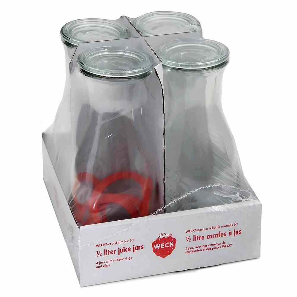 WECK 4T7-64 Saftflasche 1/2L inkl. Ringe und Klammern, klar/rot/silber (4er Pack)