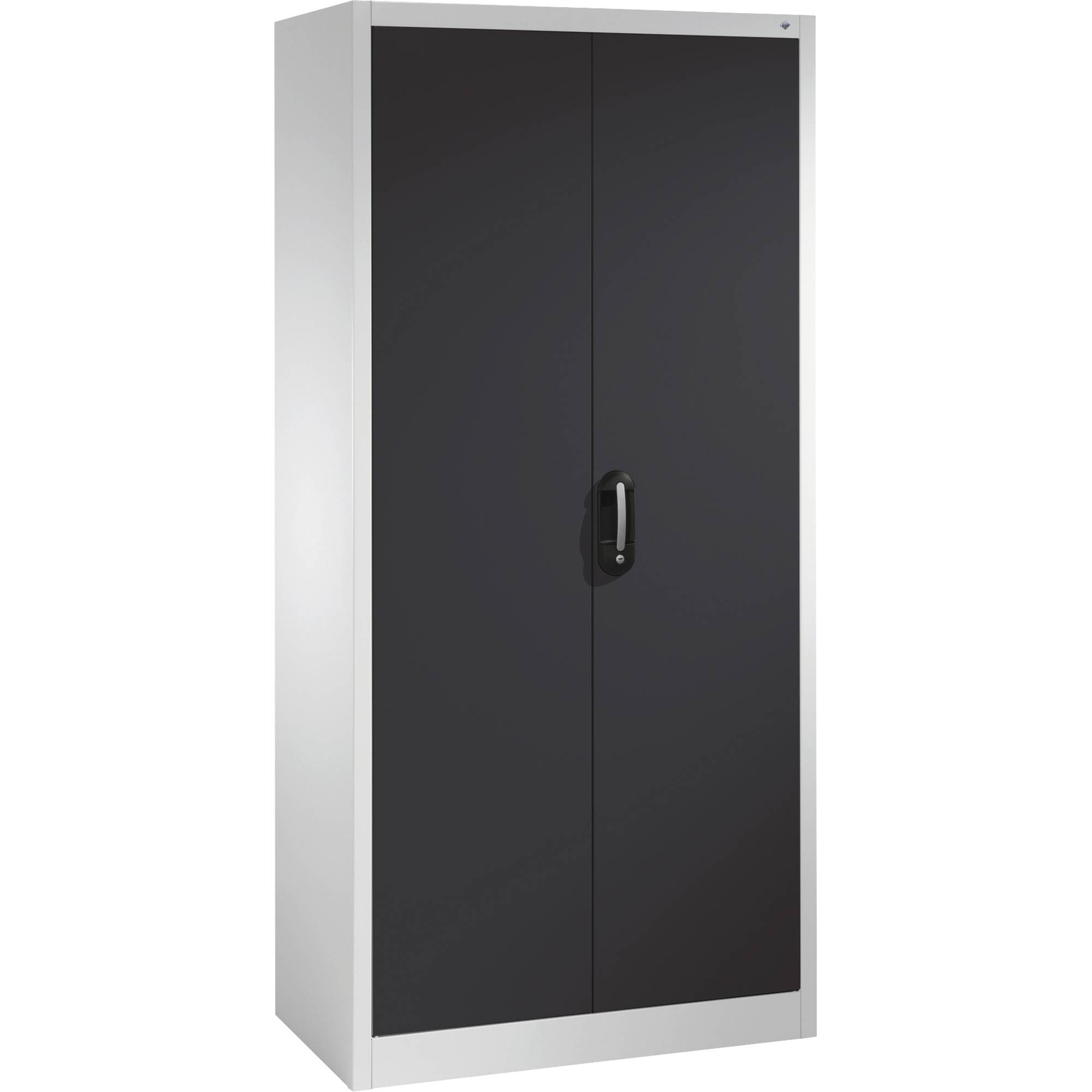 Büroschrank. Türen verstärkt für hohe Stabilität, Aufhängung oben und unten in Drehbolzen, zueinander schlagend für gemeinsamen Verschluss. Patentiertes 3-riegeliges Ergo-Lock: Zum Schließen einfach zudrücken. Achtung: Anlieferungsmöglichkeit durch Sattelschlepper muss gegeben sein.