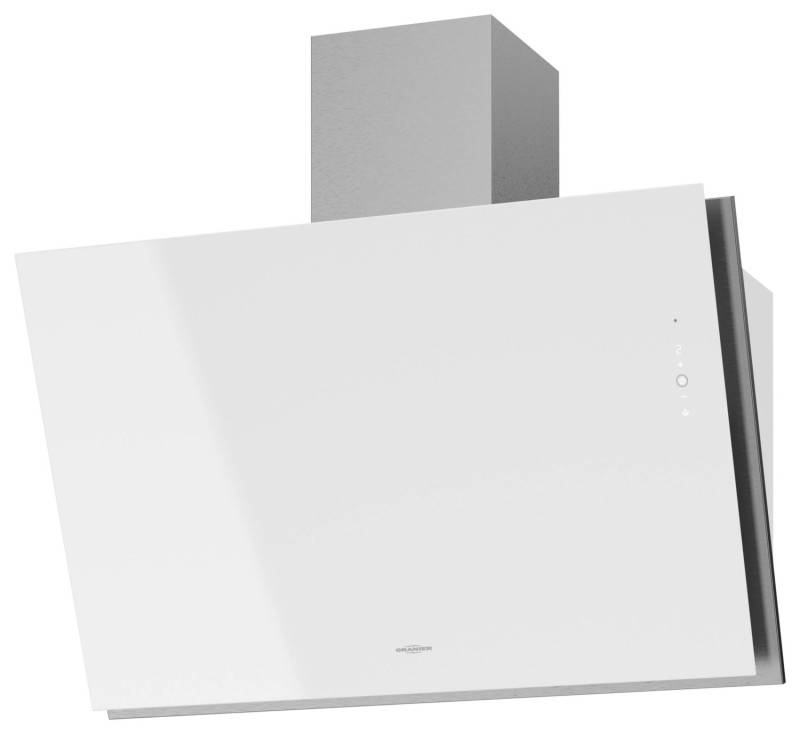 Wandhaube im Kopffrei-Design, Haubenkörper Edelstahl, Edelstahlschacht, Glasschirm Sicherheitsglas weiß, Bedienung: Touch-Control und Fernbedienung, Leistungsstufen: 3 Normalstufen, 1 Intensivstufe, Beleuchtung: 2x 2,8 W LED-Lampen (kaltweiß 4000 K), LightUP-Display weiß, Serviceöffnung mit Scharnieren, Fettfilterreinigungsanzeige, Metallfettfilter (2 Stück) innenliegend und spülmaschinengeeignet, Abluftstutzen: Ø 150/ Ø 125 mm, werkseitig auf Abluftbetrieb eingestellt, Umluftbetrieb möglich