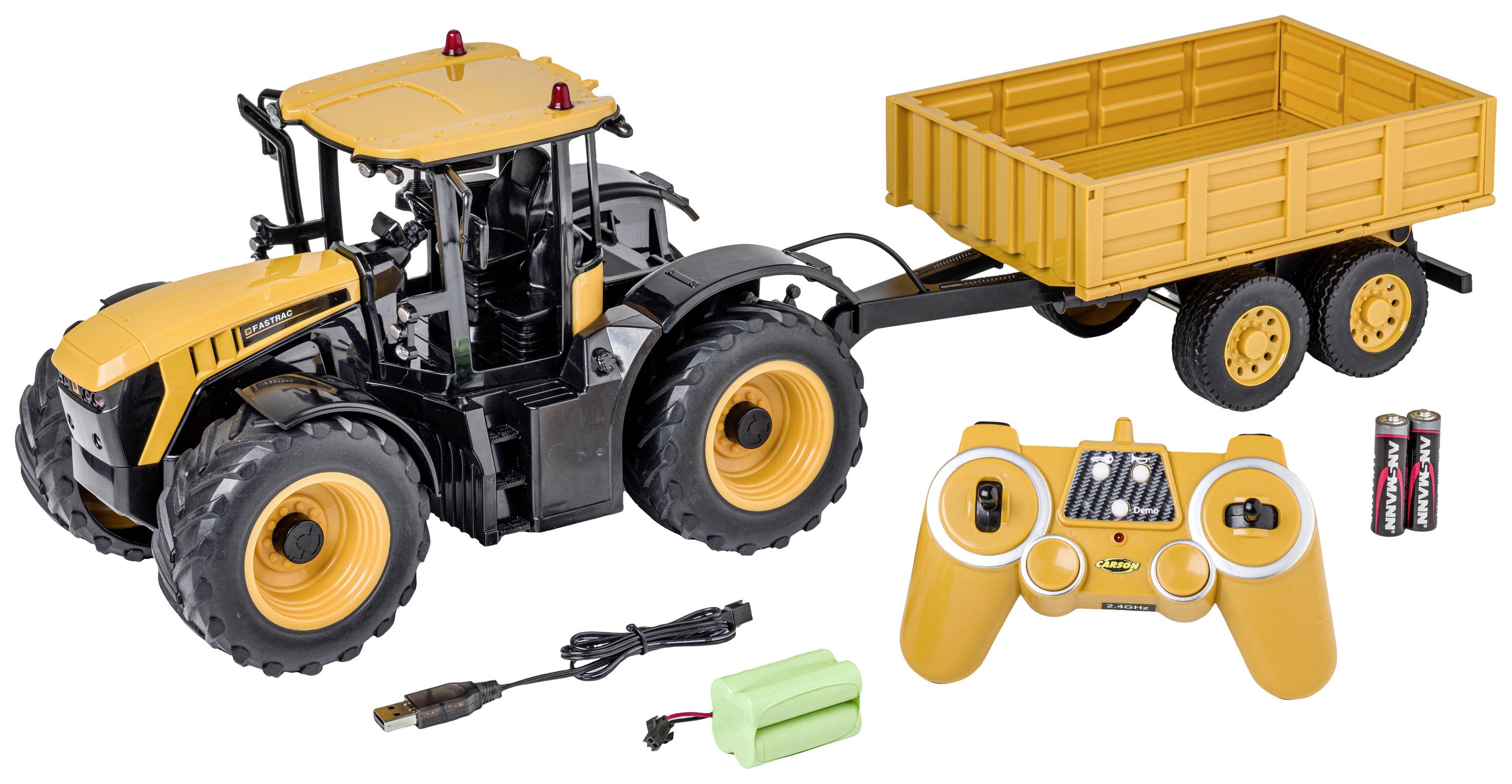 Der Traktor mit einer Lizenz des britischen Herstellers JCB überzeugt mit zahlreichen Details und Funktionen. Mit der störungsfreien 2.4 GHz Mehrkanalfernsteuerung werden Funktionen wie Licht, Hupe und Motorsound gesteuert. Dank der griffigen Bereifung mit originalgetreuem Profil bist du mit dem gelben Traktor auch draußen gut unterwegs. Der Anhänger muss manuell gekoppelt werden, wird aber über den Traktor mit Strom versorgt: So kannst du die Ladefläche des Anhängers über den Sender anheben und senken! Der Traktor ist mit Fernsteuerung, Senderbatterien, Fahrakku, Ladegerät und Anleitung voll ausgestattet und direkt nach dem Laden einsatzbereit. Kaufen – Laden – Fahren!