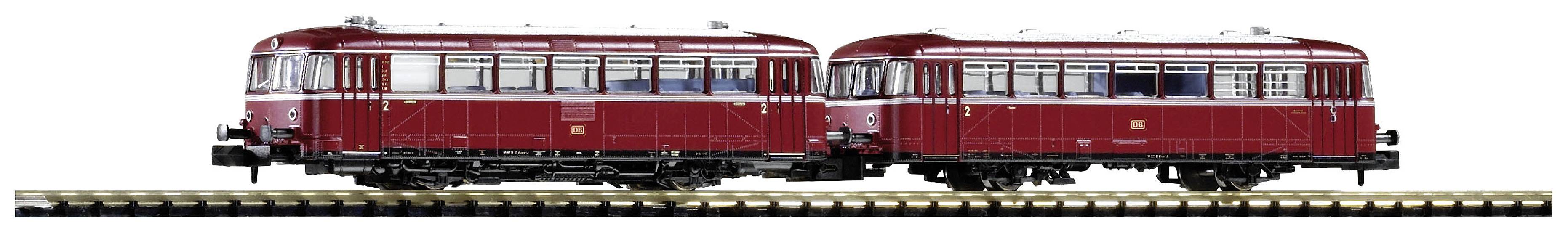 Neuheit 2022: Druckvariante des DB Schienenbusses der Epoche III. Die PIKO Modelle des Trieb- und des Steuerwagens verkörpern, wie ihre DB Vorbilder, funktionssichere Konstruktionen. Das Triebwagenmodell wird von einem Kleinstmotor angetrieben, der zugunsten einwandfreier Laufeigenschaften mit zwei präzise dimensionierten Schwungmassen ausgestattet ist. Der Antrieb wirkt auf beide Achsen des Triebwagens. Da Trieb- und Steuerwagen über eine stromleitende Kurzkupplungskinematik miteinander kuppelbar sind, können bei Einsätzen mit Steuerwagen zwei weitere (und damit vier) Achsen zur sicheren Stromabnahme herangezogen werden. Der Triebwagen besitzt eine Digitalschnittstelle PluX16 nach NEM 658, der Beiwagen besitzt eine Lötschnittstelle.Die Beleuchtungsfunktionen beider Fahrzeuge sind gesondert schaltbar. Ein freier Durchblick ist bei Trieb- und Steuerwagen durch die Fahrgasträume möglich. Der Triebwagen lässt sich vorbildgerecht auch als Triebfahrzeug für die Mitnahme einzelner Güterwagen verwenden.