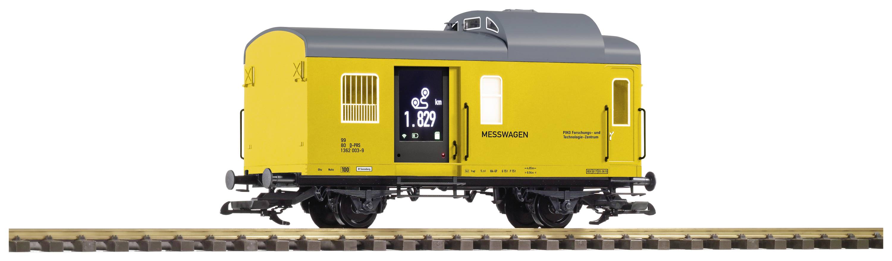 Diese herausragende Innovation im Modellbahnbereich wurde vielfach von Gartenbahn-Fans nachgefragt. Endlich ist es auch in G möglich, eine komplette Anlage zu vermessen – und das auf den Zentimeter sowie bei Steigungen auf die Promille genau! Mittels WLAN-Verbindung können die generierten Messdaten in der Smartphone- App (Android oder Apple IOS) oder auf dem PC wiedergegeben werden und auf dem PC grafisch ausgewertet werden. Auf diese Weise werden exakte Messungen auch in nicht direkt einsehbaren Anlagebereichen ermöglicht. Angelehnt an die Messfahrzeuge der DB AG überzeugt das attraktive Hightech-Wagenmodell nicht nur mit vielfältigen Messmöglichkeiten, sondern auch durch feinste Lackierung und Bedruckung sowie Innenbeleuchtung ab Werk.