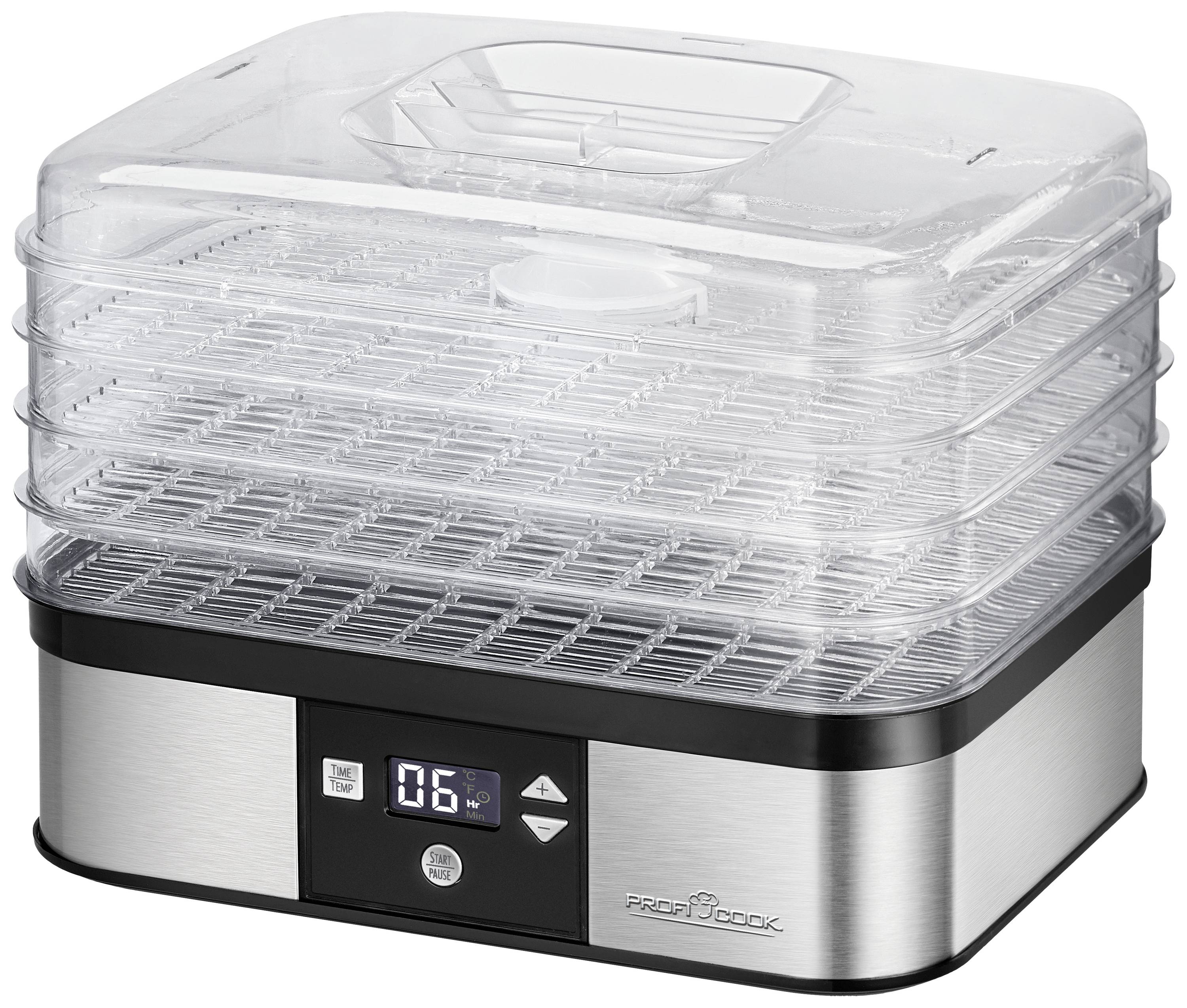 Der Dörrautomat PC-DR 1116 von ProfiCook im hochwertigen Edelstahlgehäuse trocknet Obst, Gemüse, Kräuter, Fleisch und vieles mehr. Die Lebensmittel sind reich an Vitalstoffen - perfekt für Ihr Wohlbefinden, Ihre Fitness und Ihre Gesundheit. Ganz nach Ihrem Geschmack und genauso wie Sie es brauchen: Die 7-stufige elektronische Temperatureinstellung, der elektronische Timer und die variablen Einsätze ermöglichen einen individuellen Einsatz. Sie haben die Möglichkeit Ihre Lebensmittel dank Umluftgebläse, Umluftfunktion und leistungsstarken 350 Watt zu dörren. Zusätzlich punktet das Gerät mit einem leicht ablesbaren LCD-Display, einem Überhitzungsschutz und einem rutschsicheren Stand dank gummierter Füße.
