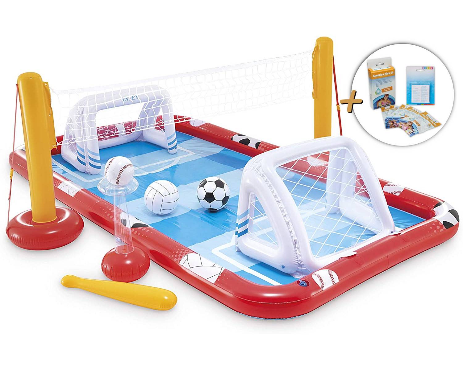 Ausgestattet mit zwei aufblasbaren Toren, einem Volleyballnetz, drei aufblasbaren Bällen, und einem aufblasbaren Baseballschläger inklusive Ball-Halterung lässt sich viel erleben und entdecken!