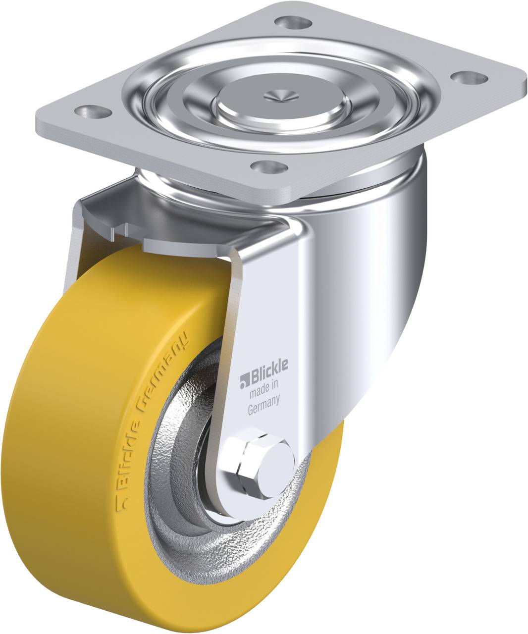 • Laufbelag: hochwertiges Polyurethan-Elastomer Blickle Extrathane®, Härte 92 Shore A, Farbe hellbraun, spurlos, kontaktverfärbungsfrei