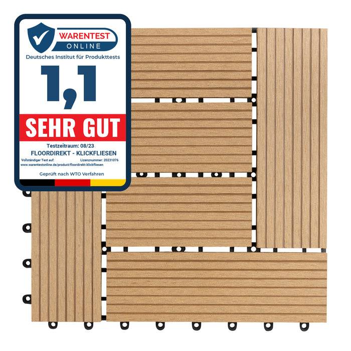 Mit unserer WPC-Terrassenfliese „Classic“ in Teak gestalten Sie Garten, Terrasse oder Balkon schnell und stilvoll – ganz ohne großen Zeitaufwand. Das bewährte Klicksystem ermöglicht eine einfache, werkzeuglose Verlegung: Fliesen aneinanderstecken, und im Handumdrehen entsteht ein einladender Außenbereich zum Wohlfühlen.
