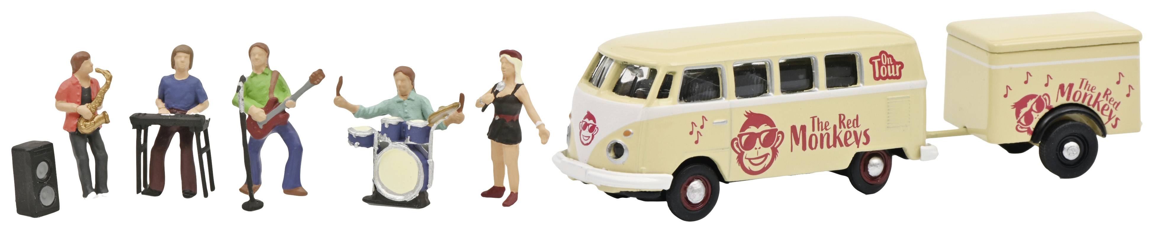 Schuco 452669100 H0 Bus Modell Volkswagen T1 Bus mit Anhänger und Band The Red Monkeys