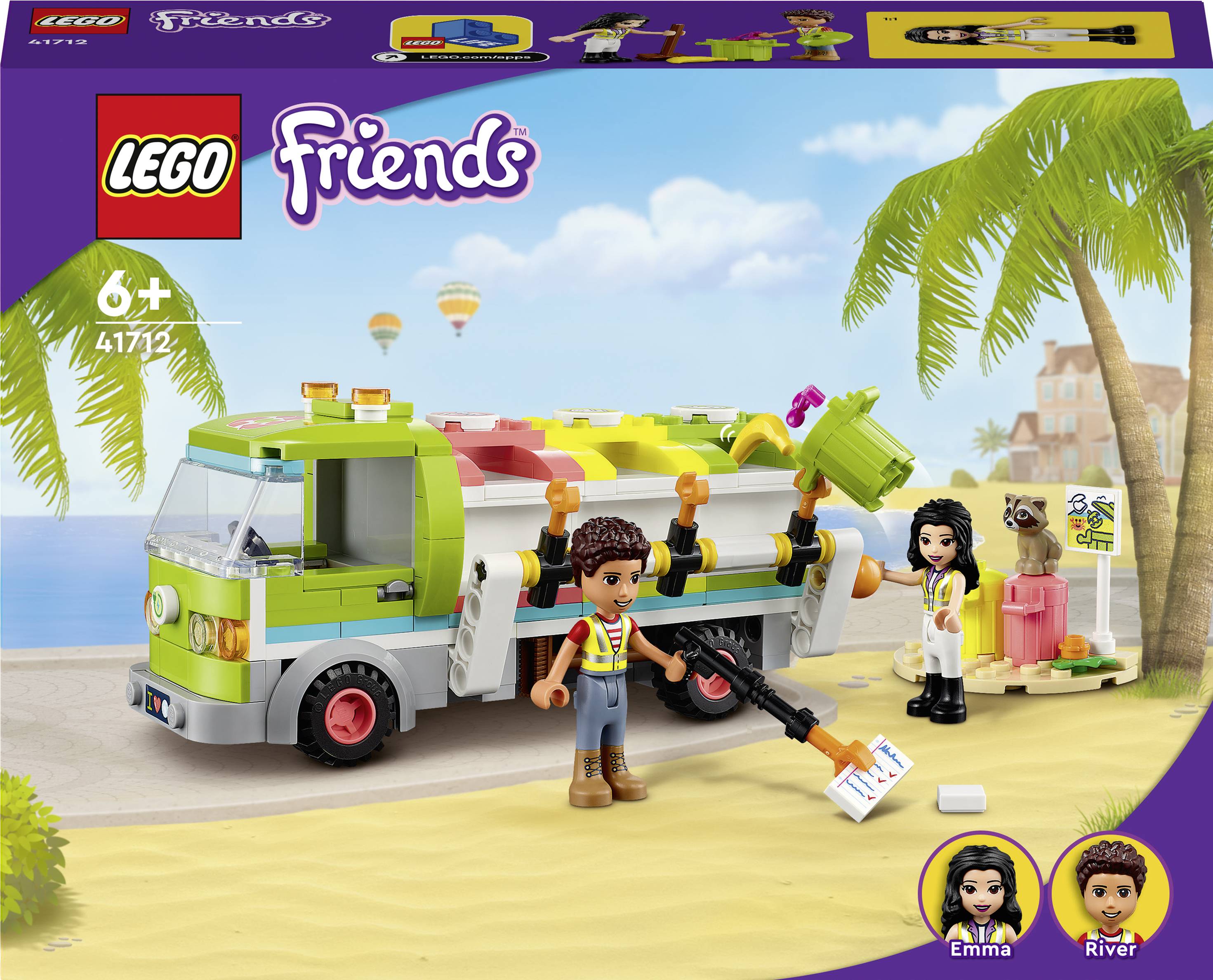 Enthält 2 Mini Puppen: LEGO Friends Emma und River, ein Waschbär, eine Bürste, eine Müllzange, Essensreste und ein Schild für den Strand