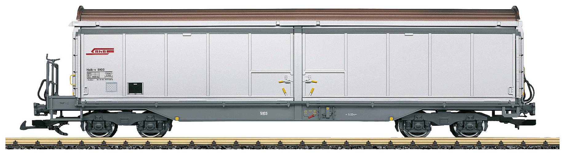Diese vierachsigen Schiebewandwagen sind auf dem Netz der Rhätischen Bahn weit verbreitet, man sieht sie nicht nur in Güterzügen, ab und zu hängt auch mal einer an einem Schnellzug. Durch die komplett zu öffnenden Wände sind sie sehr einfach zu be- und entladen, man kann mit dem Gabelstapler in den Wagen hineinfahren. Mit diesen Wagen werden vor allem witterungsempfindliche Waren transportiert, die direkt auf Paletten verladen werden. Viele dieser sind mit farbenfrohen Werbeaufschriften unterwegs, aber es gibt auch einige, die im neutralen Alu-Look fahren. 4-achsiger Schiebewandwagen der Rhätischen Bahn (RhB) mit RhB-Schriftzug. Türen mit senkrechten Streben, kurzes Dach über der Bremserbühne. Vorbildgetreue Farbgebung und Beschriftung. Die Schiebetüren lassen sich natürlich vorbildgetreu öffnen und schließen. Metallscheibenräder. Länge über Puffer 62 cm.