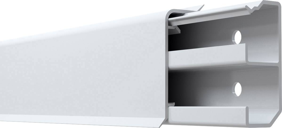 Sockelleistenkanal, SL 20x50, Abmessungen: H 50 mm x B 20 mm x L 2000 mm, aus Kunststoff, Farbe: Alpinweiß 9010, zertifiziert nach DIN EN 50085-2-1, Sockelleistenkanal zur Leitungsverlegung über dem Boden anstelle der handelsüblichen Abschlussleisten, bestehend aus Oberteil mit zwei eingefärbten elastischen Anschlusslippen zum Boden und zur Wand, Unterteil mit Bodenlochung und Unterteilung in zwei Kammern. Weitere Sockelleistenkanal-Systemkomponenten: Inneneck, Außeneck, Endstück, Kupplung (zur Verbindung von zwei Oberteilen), Flachwinkel zum Übergang auf den Leitungsführungskanal Mini 15x50 (Türumrandung oder vertikale Leitungsführung an der Wand), Geräteträger 1- oder 2-fach verfügbar je nach Installationsanforderung, Geräteträger universell bestückbar mit allen Geräten aus dem M45 Modulbaukasten.