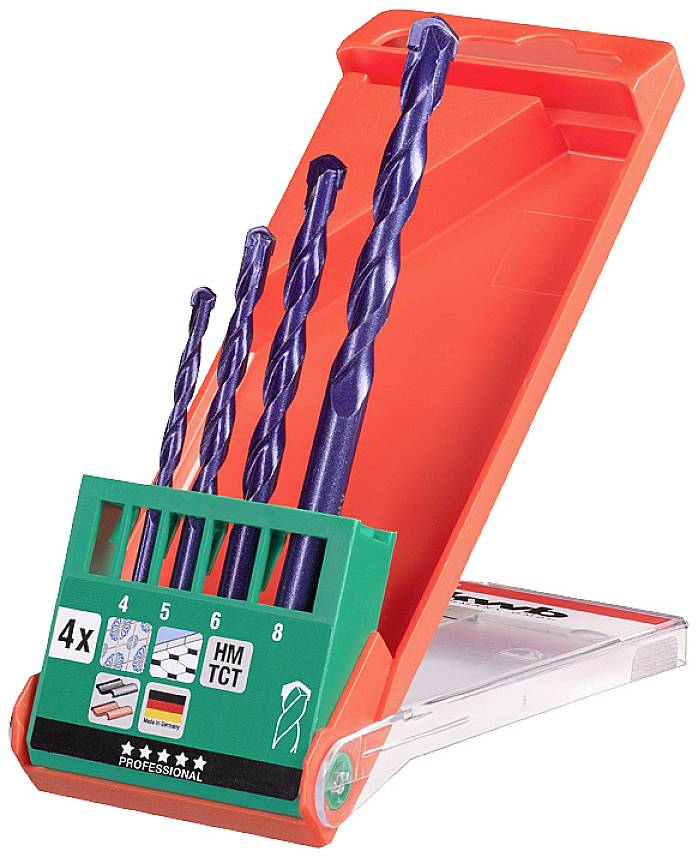 Spiralbohrer-Sortiment für alle gängigen Drehbohr-Maschinen und Schlag-Bohrmaschinen in den Durchmesser-Größen 4, 5, 6, 8 mm;Feinsteinzeug-Bohrer für extrem harte Fliesen, Dach-Ziegel, Keramik u. ä.;Steinbohrer mit extra harter Wolfram-Titan-Hartmetallspitze, diamant-geschliffen und hochtemperatur-gelötet;Bohrer-Kassette mit asymmetrisch geformter Bohr-Spirale für optimalen Bohrmehltransport – hochwertiger Bohr-Satz, ideal für Profi oder Handwerker;Made in Germany – hohe Verarbeitungs-Qualität garantiert eine lange Lebensdauer, selbst bei professioneller Daueranwendung (Artikelnummer: 051300)