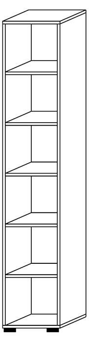 melaminharzbeschichtete Spanplatten, alle Vorderkanten mit 2 mm ABS-Kanten, Hinterkante des Korpus mit 0,6 mm ABS-Kanten · mit 4 Kunststoffbodengleitern, H 25 mm, Ø 80 mm, höhenjustierbar + 10 mm von innen durch den Schrankboden · Fachböden 22 mm, mit 2 mm ABS-Kante an den Vorderseiten, im Raster von 32 mm höhenverstellbar · Regale verleimt mit 8 mm Sichtrückwand