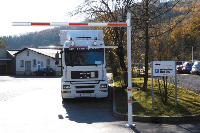 Sperrweite 3000-6000 mm · Hauptstütze aus feuerverzinktem Stahl, pulverbeschichtet weiß · verstärkter Sperrbalken aus Aluminium, pulverbeschichtet weiß mit reflektierenden rot-weißen Leuchtstreifen, optional mit Barrierebalken (nicht im Lieferumfang enthalten) · drehbar mit verstellbarer Durchfahrtshöhe bis zu 2,8 m über Flur · Gesamthöhe 3,0 m über Flur · alle Stahlbauteile feuerverzinkt oder Edelstahl · Drehpfosten aus Stahlrohr Ø 121x 4,0 mm, oben abgesetzt auf 101,6 x 4,0 mm · einteiliger Alu-Sperrbalken 86 x 46 mm, mit Schilder- und Werbekulisse · Seilzugverstärkung · Befestigung mit Dübelplatte zum Aufschrauben oder Einbetonieren · Bedienhöhe 0,7 m über Flur v abschließbar durch Vorhangschloß (im Lieferumfang nicht enthalten), alle 90° Drehwinkel an der Hauptstütze · Optional-Verriegelung erweiterbar durch Profilhalbzylinder 30/10 und Dreikantschließeinsatz nach DIN 3223 (s. Zubehör S. 870) in der Hauptstütze