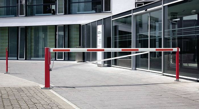horizontal drehbar · einfache und leichte Bedienung · für Einfahrten, Fußwege, ideal für enge Einbausituationen · in zwei Ausführungen lieferbar: a) Haupt- und Auflagestütze aus feuerverzinktem Stahl, Sperrbalken aus pressblankem Aluminium b) Haupt- und Auflagestütze aus feuerverzinktem Stahl, pulverbeschichtet rot, Sperrbalken aus Aluminium, pulverbeschichtet weiß zzgl. roter retroreflektierender Warnstreifen · Befestigung mit Dübelplatte zum Aufschrauben, auf Anfrage auch zum Einbetonieren lieferbar · abschließbar durch Vorhängeschloss (im Lieferumfang enthalten) oder mit Profilzylinder an der Auflagestütze auf Anfrage