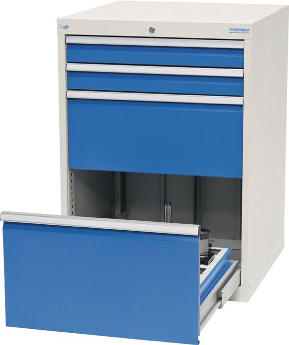 präzise verarbeitete Stahlblechkonstruktion, pulverbeschichtet lichtgrau, RAL 7035/lichtblau, RAL 5012 · mit Zentralverschluss und Einzelauszugsperre · Schubladen 2 x 100 mm, 1 x 300 mm, 1 x 400 mm, mit Vollauszug · Schubladeninnenmaße B 600 x T 600 mm · komplett mit 1 bzw. 2 entnehmbaren Schubladenrahmen mit 5 Kassetten, inkl. CNC-Kunststoffeinsätzen Typ SK / HSK / VDI / Capto nach Wahl Vollauszug 100 % - Schubladenhöhe ab 100 mm, Tragfähigkeit 100 kg - Schubladenhöhe ab 300 mm, Tragfähigkeit 180 kg Bitte immer die gewünschte Einsatzgröße angeben. Bestückung: 35 Stück SK30 / VDI30 / Capto C4 35 Stück SK40 / VDI40 / HSK A50 / HSK A63 / Capto C5 20 Stück SK50 / VDI50 / Capto C6 20 Stück HSK A32 / HSK A40 / HSK A100 / Capto C3 / Capto C8 / Universaleinsatz
