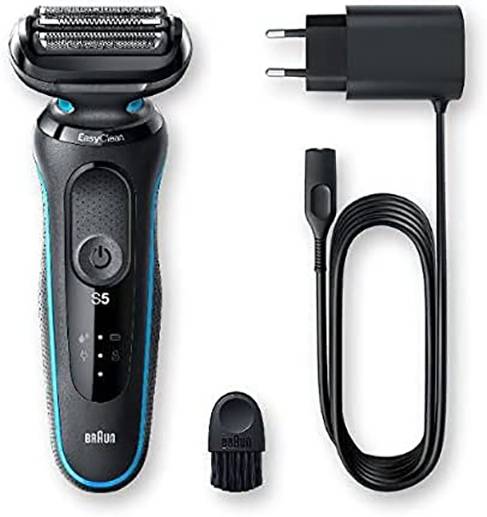 Der Braun Series 5 Elektrorasierer für Herren für eine einfache Rasur mit 3 flexiblen Klingen, die sich an Ihre Gesichtskonturen anpassen. Der Rasierer wird in Deutschland hergestellt.Das EasyClean System bietet eine schnelle und einfache Reinigung, ohne Abnahme des Scherkopfs.Kompatibel mit EasyClick-System. Ihr Rasierer kann mit einem einfachen Klick umgerüstet und die Aufsätze ausgetauscht werden – für noch mehr Funktionen. Der Lithium-Ionen-Akku ermöglicht ein Rasieren von bis zu 3 Wochen (50 Minuten Akkulaufzeit) und eine 5-minütige Schnellladung, die für eine Anwendung reicht. Dieser elektrische Rasierer für Herren ist 100% wasserdicht und für die Nass- und Trockenrasur geeignet.