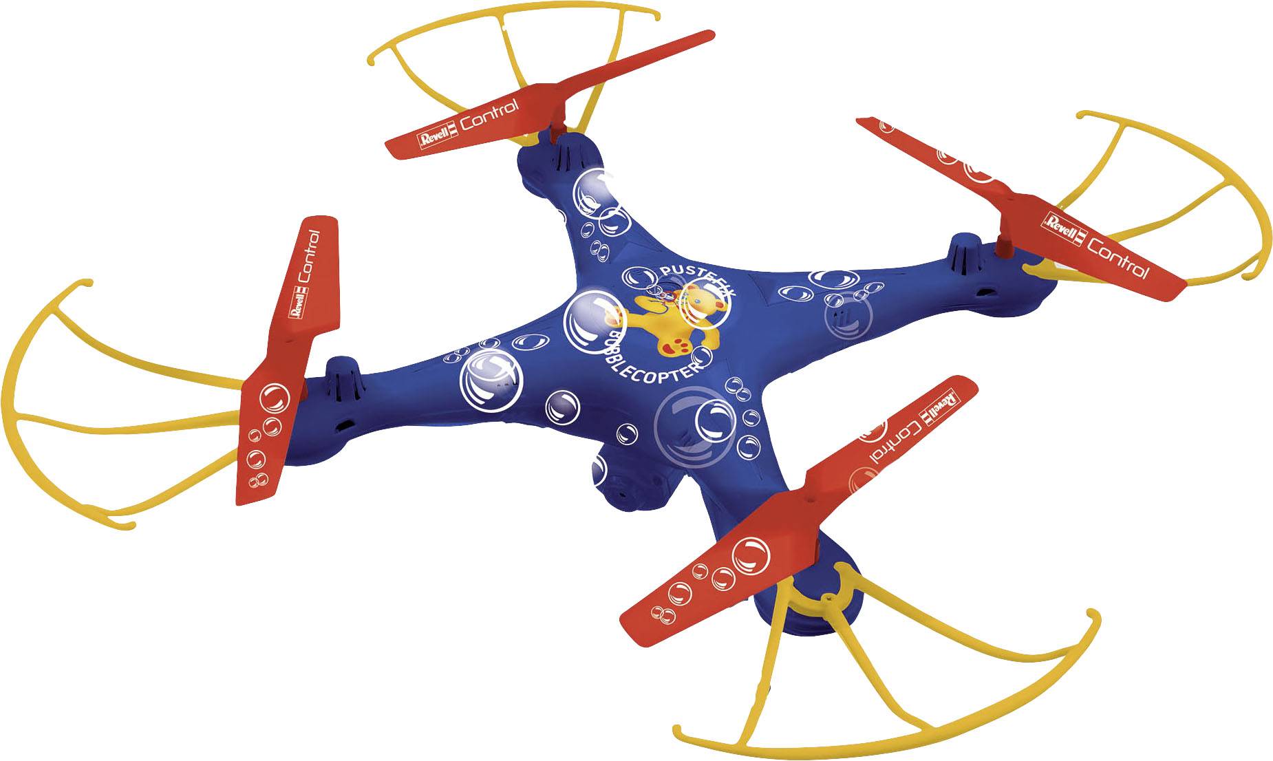 Seifenblasen aus der Luft! Der innovative Revell Control Bubblecopter sorgt nicht nur auf allen Events und Feiern für die richtige Stimmung, sondern auch bei Spaß im Garten oder im Park, denn er füllt die Luft mit schimmernden Seifenblasen von Pustefix. Der Tank des GHz-Quadrocopters wird einfach mit der hochwertigen Seifenblasenflüssigkeit nach dem Original Pustefix-Geheimrezept befüllt und erzeugt auf Knopfdruck an der Fernbedienung schillernde Blasen. Natürlich ist er im Design des Kult-Seifenblasenherstellers mit dem Teddy gestaltet. Der LiPo-Akku ist austauschbar; Zusatzakkus sind separat erhältlich – so kann die beeindruckende Show schnell weitergehen.