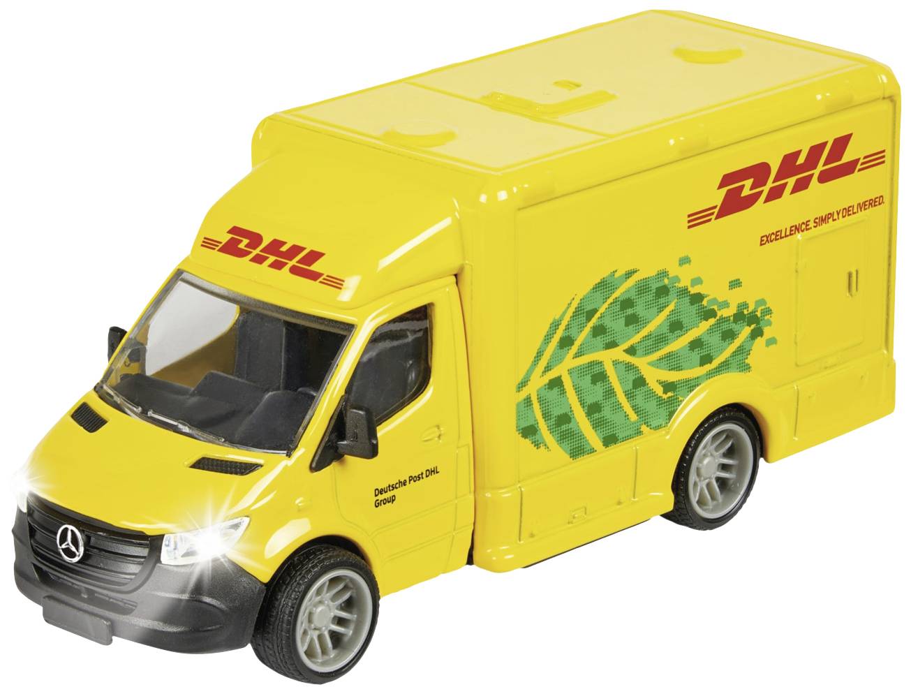 Für ordentlich Spaß sorgen zahlreiche Funktionen. Der Sprinter besitzt nicht nur zwei verschiedene Sounds und zwei Front-Scheinwerfer, die kinderleicht bedient werden können, sondern auch Beleuchtung im sehr detaillierten Innenraum. Das DHL-Kurier-Modell bietet zusätzlich Hecktüren zum Öffnen, realistische Weichgummireifen mit Profil sowie transparente Fenster.