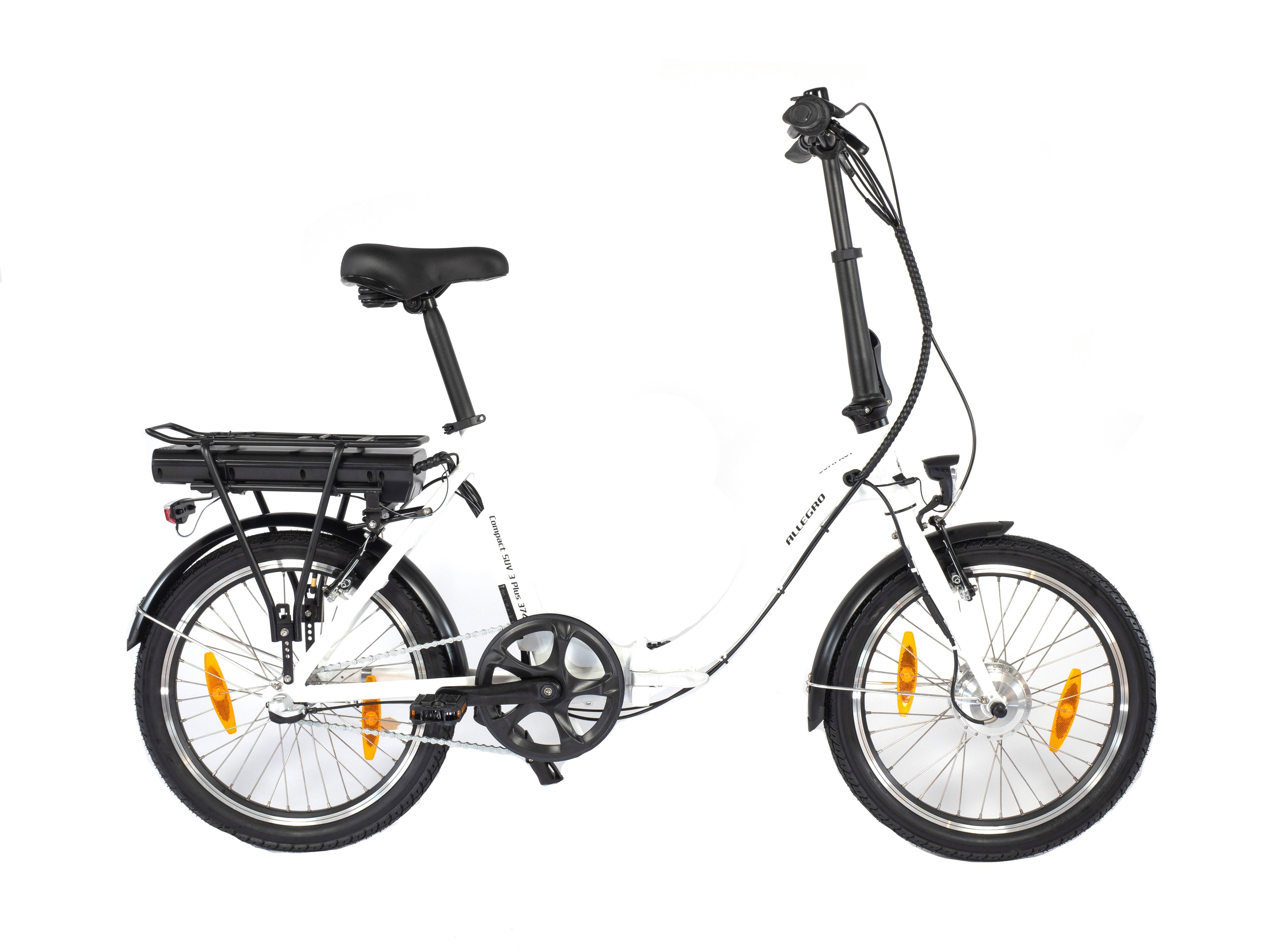 Das kompakte Allegro E-Klapprad besitzt eine Kenda Bereifung mit Reflektorstreifen, die neben der serienmäßig angebrachten Lichtanlage zu einer besseren Sichtbarkeit durch andere Verkehrsteilnehmer führt. Die 20“ Reifen sind besonders breit, was sowohl Komfort als auch Pannenschutz erhöht. Der Komfortsattel bleibt auch auf längeren Ausflügen bequem und lässt sich durch die höhenverstellbare Sattelstütze schnell auf die Größe des Fahrers einstellen. Neben dem 42 cm hohen Rahmen lässt sich auch der Vorbau sowie die Pedale zusammenfalten. Somit passt das Rad locker in jeden Kofferraum und kann problemlos in Bus und Bahn mitgeführt werden. Mit seinen 21 kg (max. zulässiges Gesamtgewicht 130 kg) zählt das Allegro Compact SUV 3 Plus 374 zu den leichteren Pedelecs und erfüllt somit seinen Zweck der vereinfachten urbanen Fortbewegung. Erhältlich ist es in den zeitlosen Farben Schwarz oder Weiß.