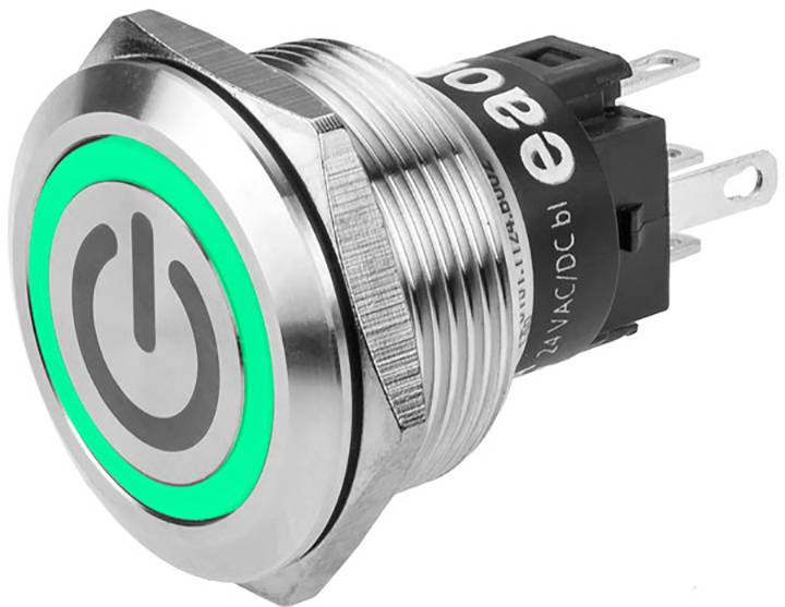 Switching Action: Momentary; Function: Illuminated Push Button; Switching Current: 3A; Switching Voltage: 240V AC/DC; Operating Voltage: 24V AC/DC; Contacts: 1 C; Contact Material: Silver; Housing Material: Stainless Steel; Housing Colour: Silver; Button Material: Stainless Steel; Button Colour: Silver with Green Illumination; Button Diameter: 25 mm; Mounting cut-out: 22.3 mm; Front IP protection: IP65|IP67; Weight 0.018 kg;