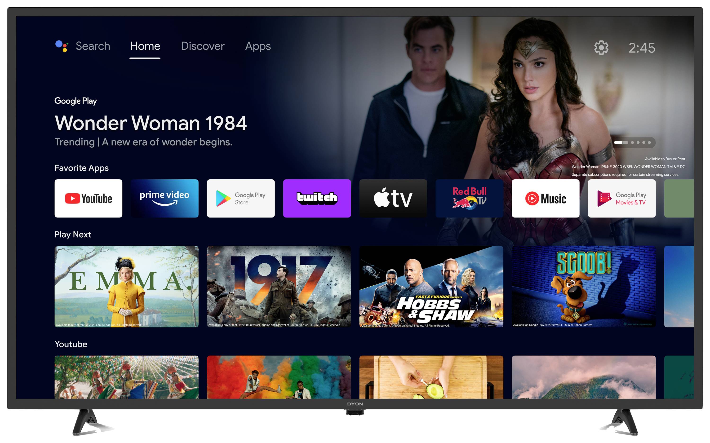 Genießen Sie die volle Freiheit mit der neuen Smart AD-2 Serie von DYON. Nutzen Sie kinderleicht das vorhandene Android TV Smartportal, welches Ihnen eine Vielzahl an Apps wie z.B. Prime Video, Netflix und YouTube bereitstellt. Durch den Zugriff auf den Google Play Store haben Sie die Möglichkeit viele weitere Apps wie z.B. Disney+, DAZN uvm. zu installieren. Das neue Android TV 11.0 Betriebssystem lässt dabei durch seine Performance und Flexibilität keine Wünsche offen. Bedienen Sie Ihren DYON Smart AD-2 TV bequem per Sprachbefehl über den Google Sprachassistent oder starten Sie Netflix, Prime Video oder YouTube per Schnellstarttaste auf Ihrer Fernbedienung. Mit Chromecast verbinden Sie zudem Ihr Smartphone oder Tablet kabellos mit Ihrem TV und teilen Urlaubsbilder, Videos oder Musik mit Ihren Liebsten. Der integrierte Triple Tuner sorgt des Weiteren für den Empfang von Kabel- (DVB-C), SAT- (DVB-S2) oder terrestrischen Fernsehen (DVB-T2). Dank einer PVR Funktion verpassen Sie nie mehr Ihre Lieblingssendung. Erleben Sie smartes Fernsehen neu.