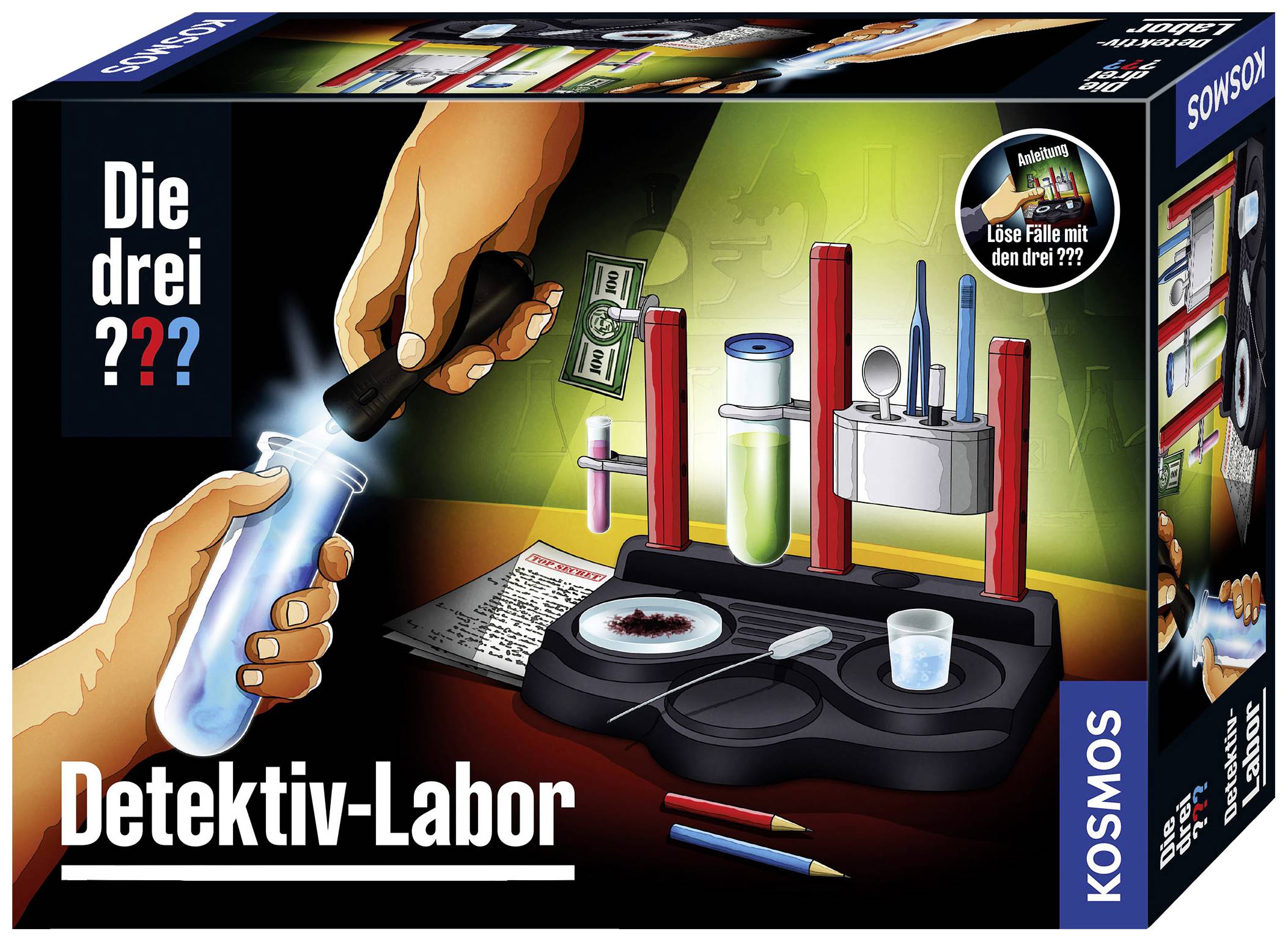 Was genau ist am Tatort geschehen? Wurde irgendwo ein Fingerabdruck übersehen? Dinge mit UV-Licht sichtbar machen, geheime Tinte herstellen, Versuche mit Säuren und Basen: Spurensicherung ist spannende Kleinstarbeit. Kinder ab 8 Jahren lernen mit diesem Set die aufregende Welt der Forensik kennen. Spannende Kurzgeschichten von Justus, Peter und Bob aus Rocky Beach leiten in die Versuche ein. Gemeinsam mit ihren Lieblingshelden schlüpfen Mädchen und Jungen in die Rolle von Kriminologen. Dabei lernen sie mithilfe von Chemie Verborgenes sichtbar zu machen. Eine geniale Kombi: Detektiv Gadget, Rollenspiel und Labor in einem! Das Detektiv-Spiel ist ein super Geburtstagsgeschenk.