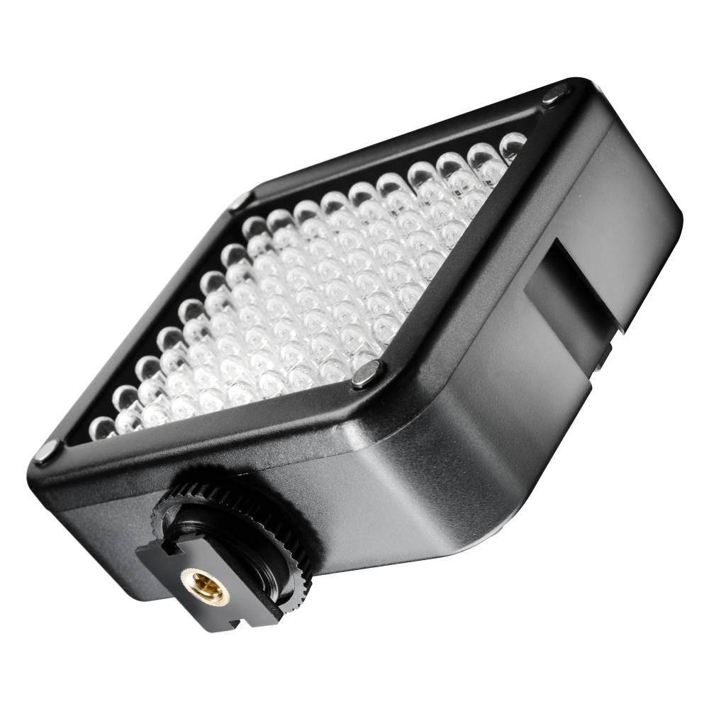 Kompakt und selbstbewusst präsentiert sich die Video-Flächenleuchte von walimex, die mit seinen 80 leistungsstarken LED-Dioden jeden Hobbyfilmer und Videografen überzeugt. Machen Sie die Nacht zum Tag und sorgen Sie für helle Momente: Die mit 5 AA-Batterien betriebene Videoleuchte ist ideal geeignet für alle Camcorder und Videokameras. Die 80 stufenlos dimmbaren LED sorgen für eine hohe Lichtausbeute und damit für die nötige Helligkeit bei nicht ausreichendem Umgebungslicht. Dies ist besonders praktisch bei Aufnahmen im Dunkeln oder unzureichend ausgeleuchteten Räumen. Somit müssen Sie nie wieder schlecht beleuchtete Filme befürchten! Profitieren Sie von der flexiblen Erweiterbarkeit: Die Flächenleuchte ist nicht nur im Hoch- und Querformat nutzbar, sondern durch die durchdachte Bauart auch flexibel erweiterbar. Das über den Blitzschuh anzubringende Gerät kann mit weiteren Videoleuchten zusammengesteckt und dann z.B. zu einer größeren Flächenleuchte ausgebaut werden. Außerdem bieten wir zusätzlich optional erhältliche Montageschienen an, auf denen Sie die Videoleuchte in bestimmten Positionen und in Verbindungen mit mehreren Lampen nutzen können und damit für das Plus an Helligkeit sorgen können. Die mit einer Batterieanzeige und einem 1/4 Zoll Anschluss Gewinde versehene Flächenleuchte verfügt über 580 Lux (gemessen bei 1m Abstand). Unser Tipp: Bestellen Sie gleich den Zusatzakku und die praktischen Montageschienen mit.