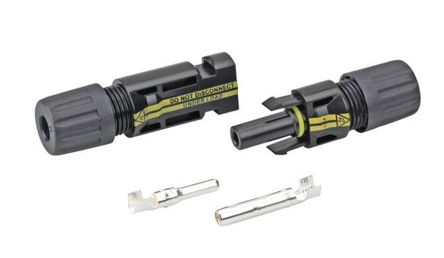 Photovoltaik-Steckverbinder-System. Der Einsatz dieses neuen Photovoltaik-Steckverbinders spart auf der Baustelle Arbeit und Zeit. Das Cimco-Steckverbinder-System ist kompatibel zu dem Marktstandard MC4 und ist passend für alle gängigen Solarkabel von 2,5 mm² bis 6 mm². Bestehend aus Verbindungssystem Stecker und Buchse inkl. Kunststoffgehäuse im Polybeutel und je 100 Stück Buchsen-Crimpkontakte sowie Kunststoffgehäuse im Polybeutel. Technische Daten: 2,5 bis 6 mm², Spannungsbereich: 1.000 V, Strombelastbarkeit: 30 A (4 mm², 6 mm²), Kontaktwiderstand des Verbindersystems: 5 m?, Durchmesser des Steckerkontaktes: 4 mm, Schutzklasse: IP 67, Temperaturbereich: -40°C/+85°C, Isolationsmaterial: PC/PA, Kontaktmaterial: Kupfer, versilbert, Sicherheitsklasse: II, Zertifizierung: TÜV, Crimpbereich: 2,5 - 6 mm². Ausführung: Set male + female