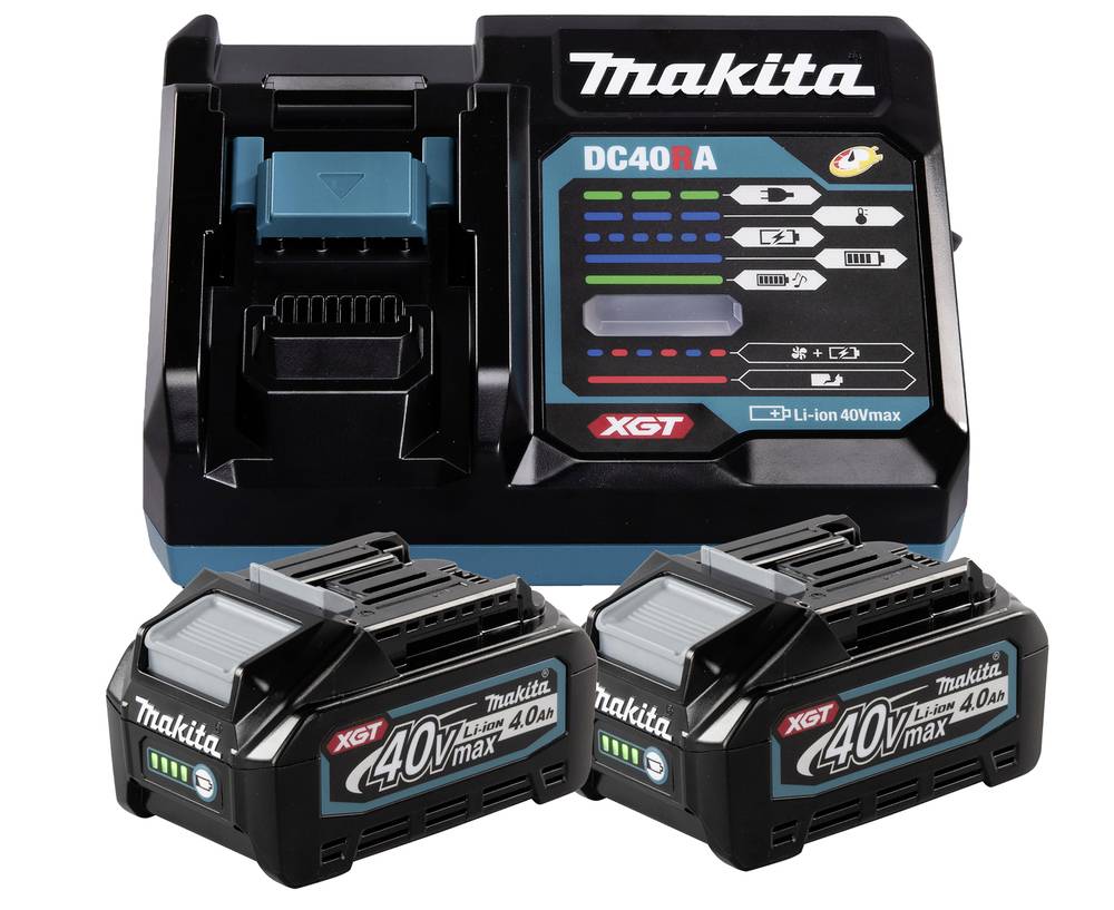 Power Source-Kit bestehend aus 1 Schnellladegerät DC40RA, 2 Akkus BL4040, 4,0 Ah.