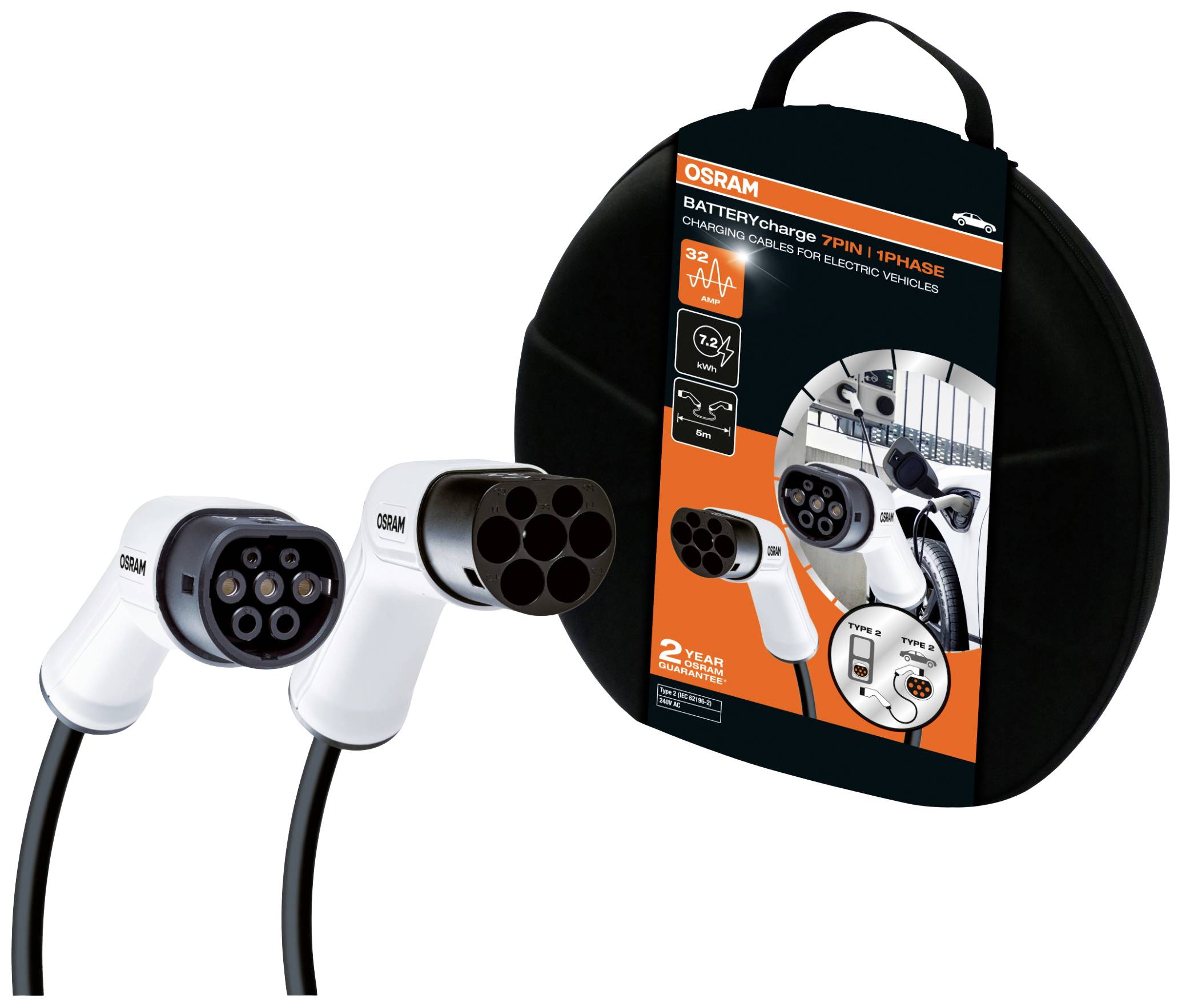 Entdecken Sie die Welt des elektrischen Fahrens mit OSRAM. Laden Sie Ihr vollelektrisches oder Plug-in-Hybrid-Fahrzeug des Typs 2 an jeder 32A (1 Phase) Ladestation, die mit einem Typ-2-Anschluss ausgestattet ist. Das Ladekabel verfügt über ergonomische Griffe für eine optimale Handhabung und hat eine Kabellänge von 5 Metern. Es ist für den Einsatz an öffentlichen Ladestationen und auch für zu Hause geeignet. Außerdem sind die Ladekabel mit Staubschutzkappen ausgestattet und auf Wasserdichtigkeit nach IP65 und Stoßfestigkeit nach IK10 geprüft. Auch im angeschlossenen Zustand sind die elektrischen Kontaktstellen gemäß IP65 und IK10 gegen das Eindringen von Staub und Spritzwasser im geschützt. Im Lieferumfang ist auch eine strapazierfähige, kompakte Aufbewahrungstasche enthalten, um das Kabel nach dem Ladevorgang wieder ordentlich verstauen zu können.
