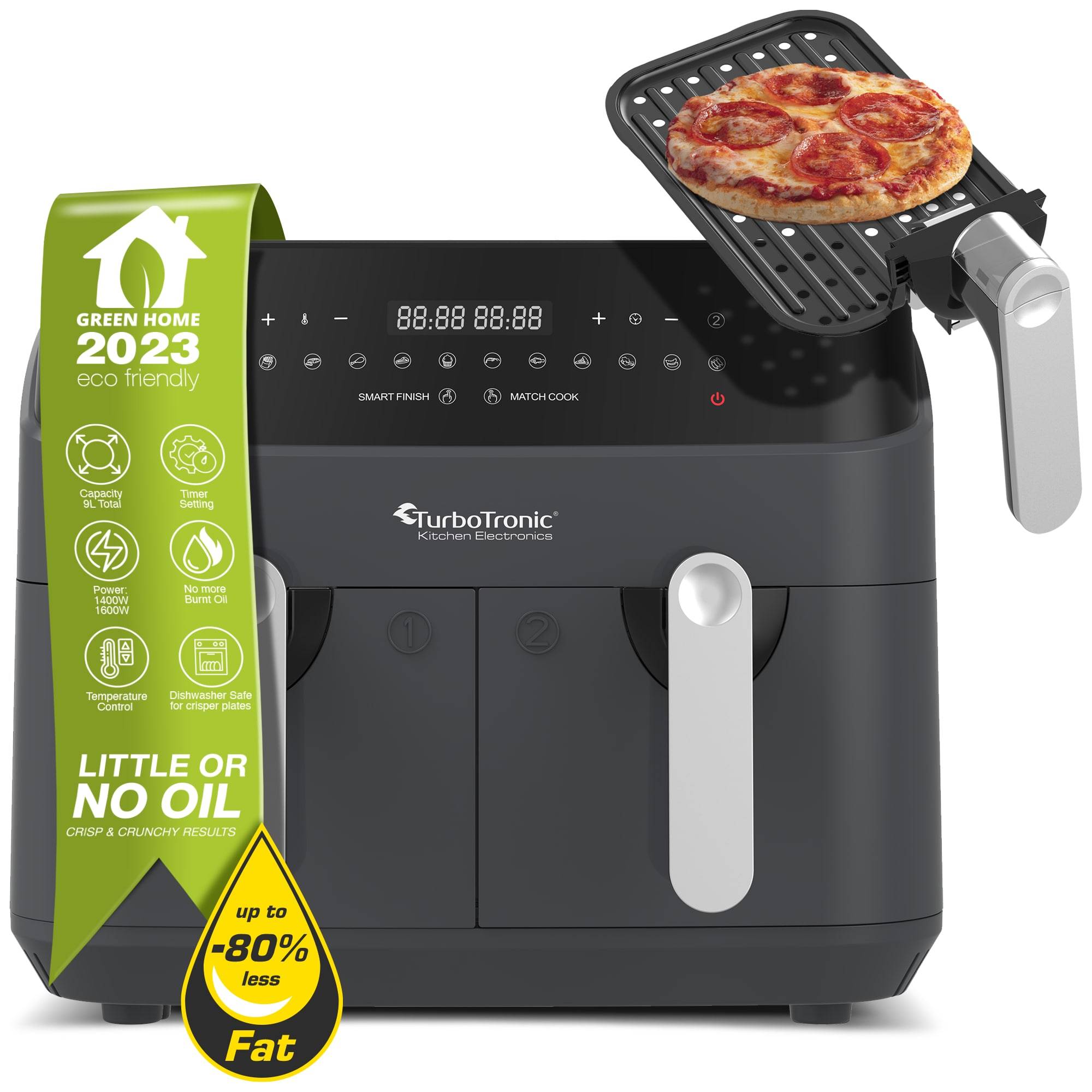 - XXL Heißluftfritteuse 2x 4,5L Fassungsvermögen köstliche Speisen für Sie oder die ganze Familie - bis zu 2x 1kg Pommes in einem Durchgang (25 min Garzeit - absolut köstlich)
